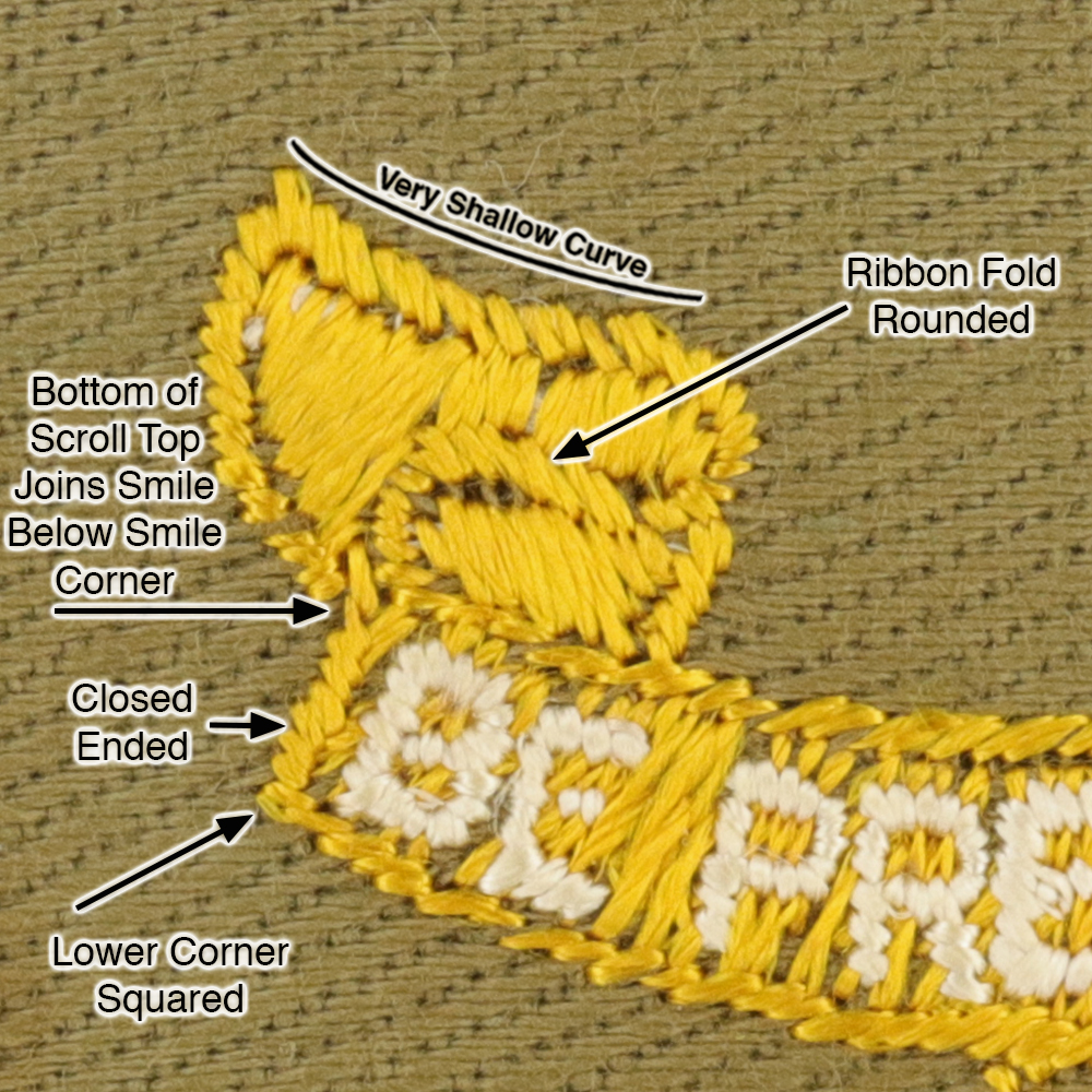 - Scroll Left: Very shallow concave curve scroll top, ribbon fold rounded, bottom of scroll top joins smile below smile corner, closed ended smile, lower corner of scroll squared