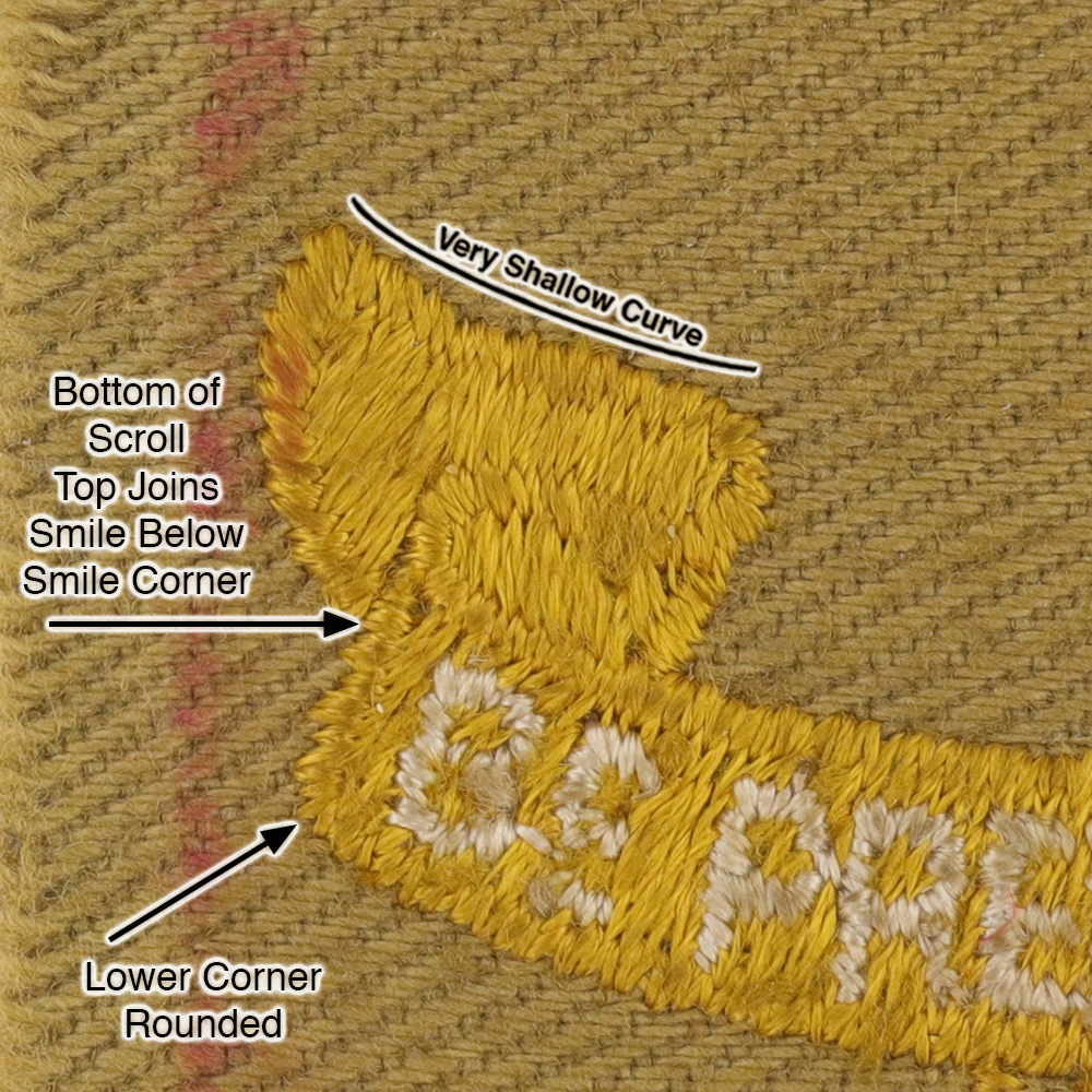 - Scroll Left: Very shallow concave curve scroll top, bottom of scroll top joins smile below smile corner, closed ended smile, lower corner of scroll rounded