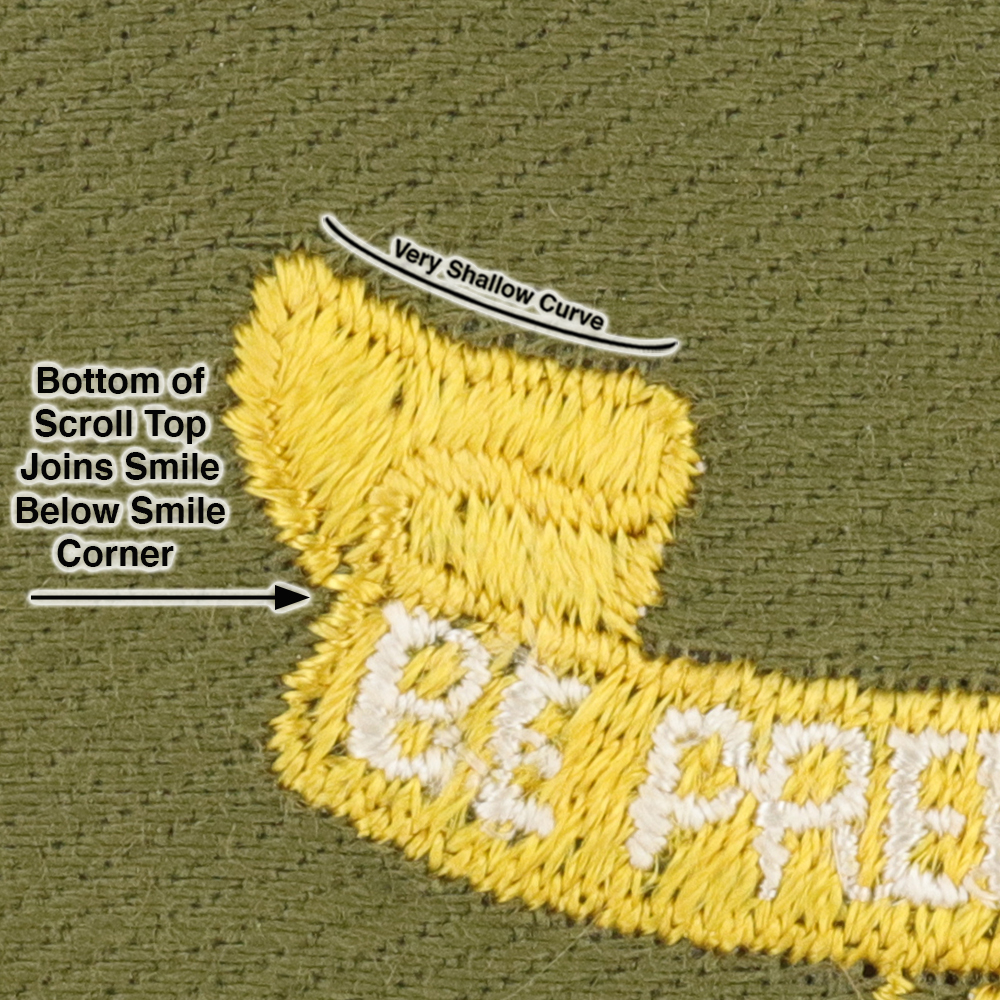 - Scroll Left: Very shallow concave curve scroll top, bottom of scroll top joins smile below smile corner, closed ended smile