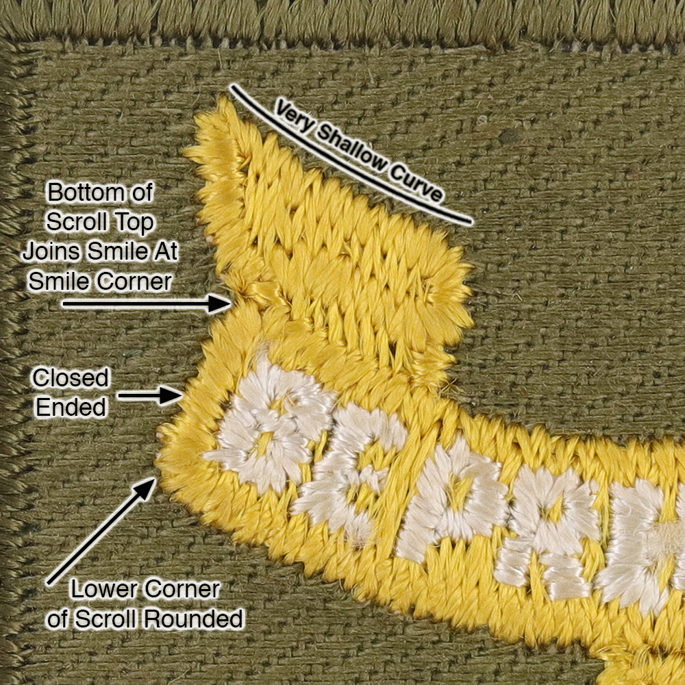 - Scroll Right: Very shallow concave curve scroll top, bottom of scroll top joins smile at smile corner, closed ended smile, lower corner of scroll rounded