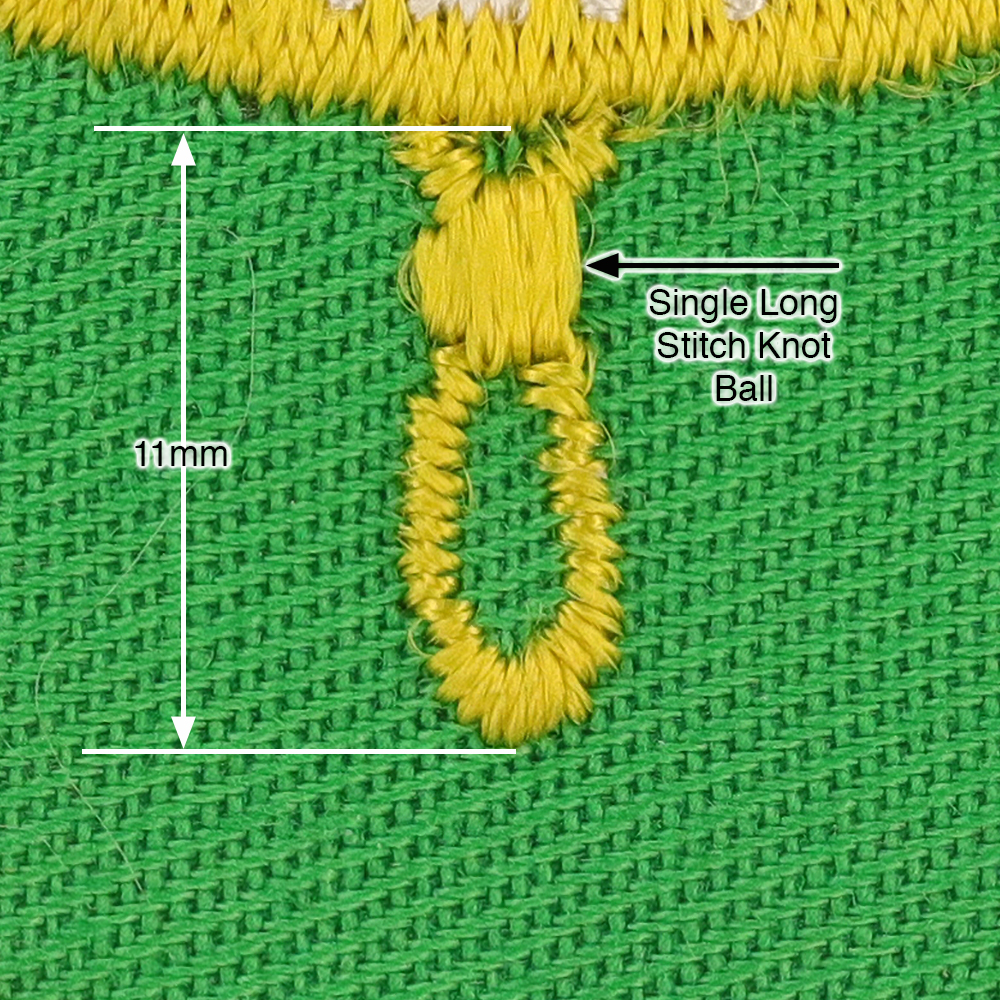 - Knot: 12mm rounded tip, single long stitch knot ball