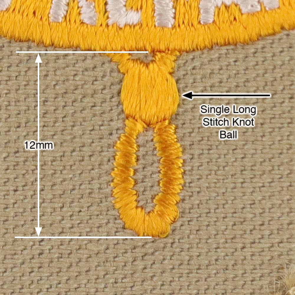 - Knot: 12mm rounded tip, single long stitch knot ball
