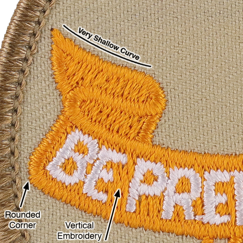 - Scroll Left: Tip curves up, very shallow concave curve scroll top, vertical embroidery, rounded bottom corner