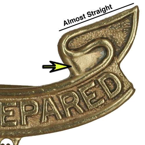 - Left Side: Full letter space between E and P, left edge of scroll is straight with extended bottom, bottom of scroll turns up on lower left, inner edge of ribbon has raised edge