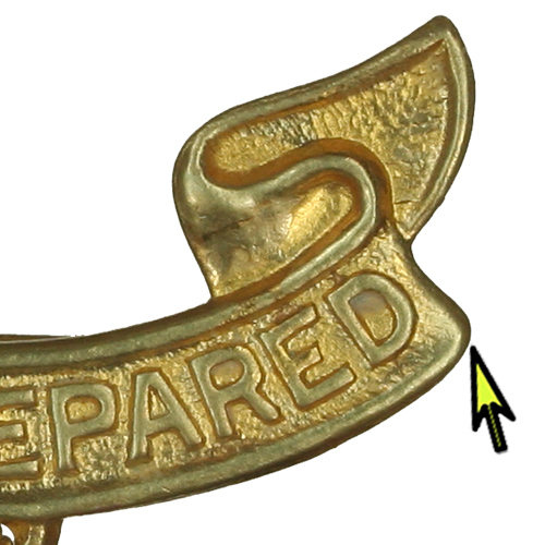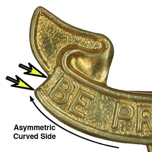 - Left Side: Bottom edge of ribbon joins scroll 1/3 from top of scroll, left edge of scroll is straight with extended bottom, bottom of scroll turns up on lower left