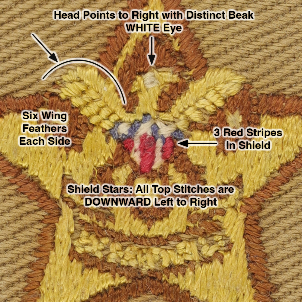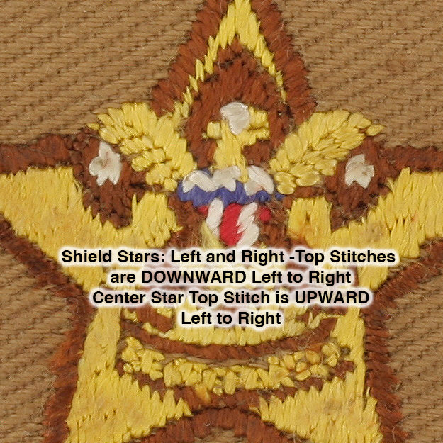 - Shield Stars: Left and right star top white stitches are DOWNWARD left to right, center star top white stitche is UPWARD left to right