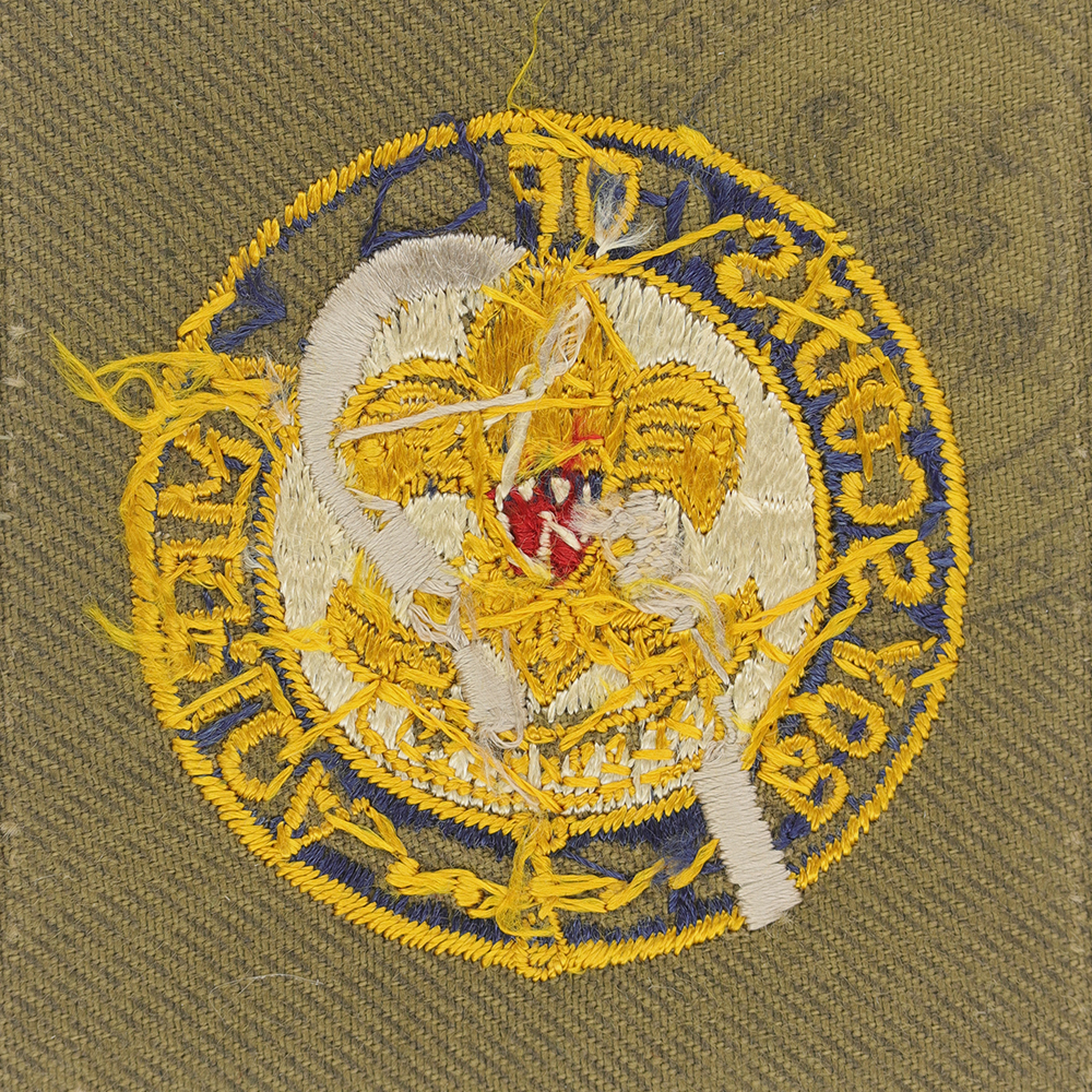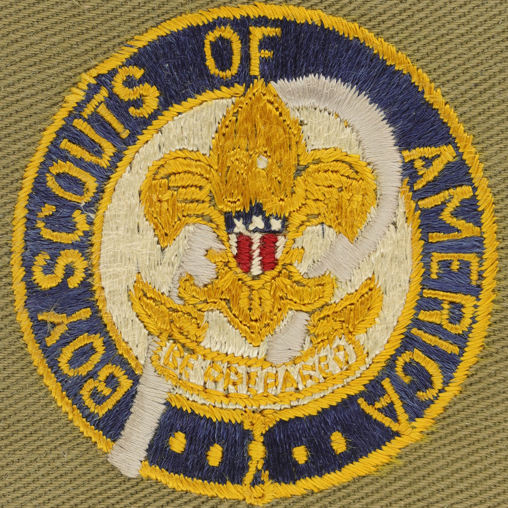 - Design: Gold First Class emblem with white behind emblem, silver shpherd's crook, gold border and lettering "BOY SCOUTS OF AMERICA", dark blue behind letters