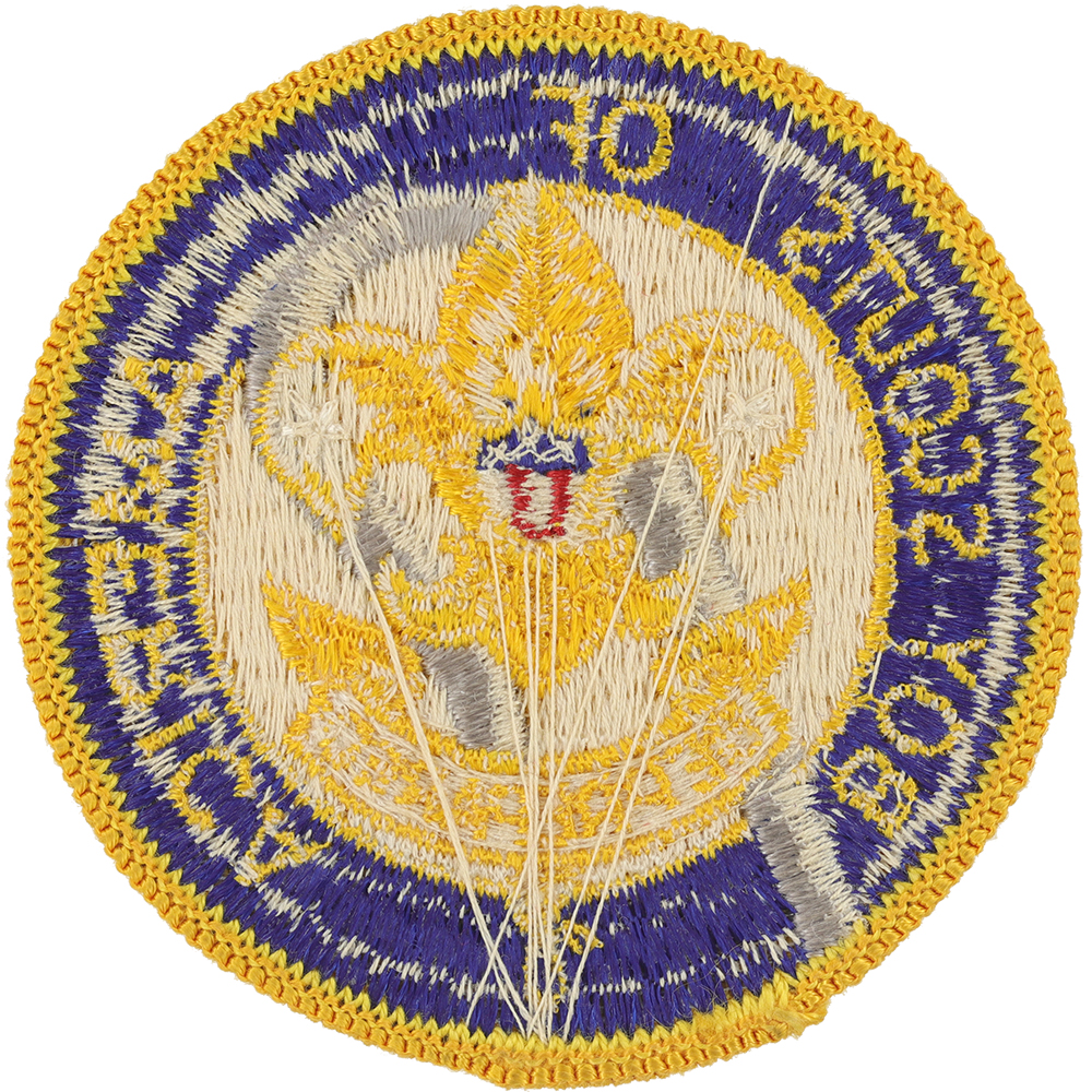 - Design: Gold First Class emblem with white behind emblem, silver shpherd's crook, gold border and lettering "BOY SCOUTS OF AMERICA", blue behind letters