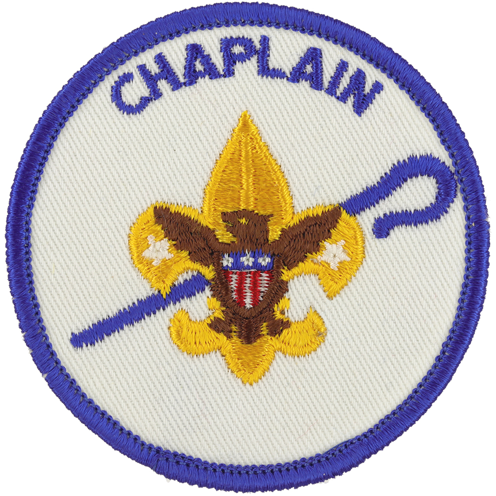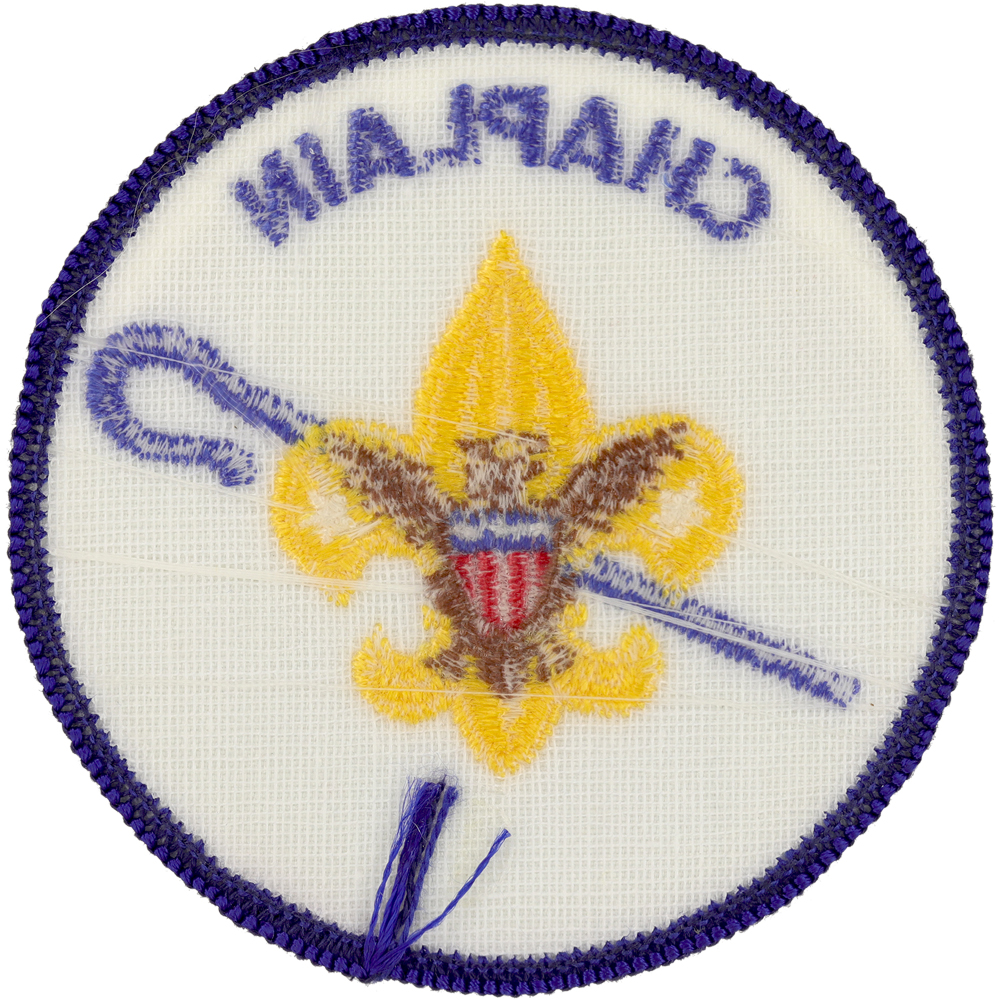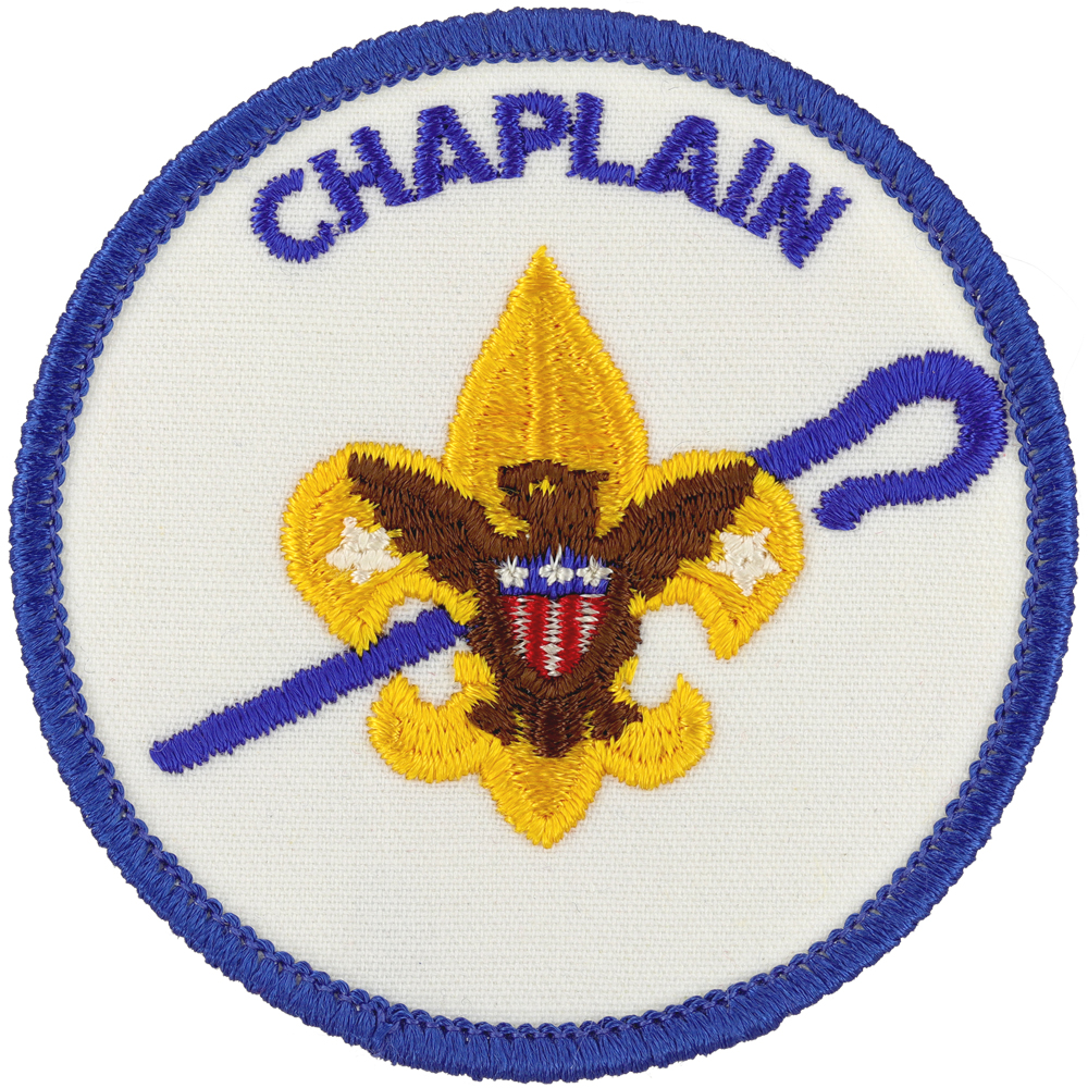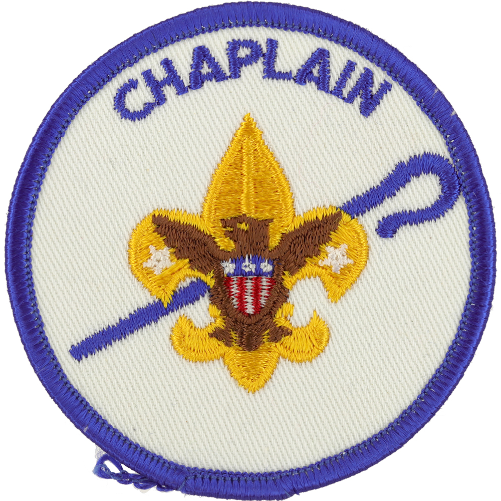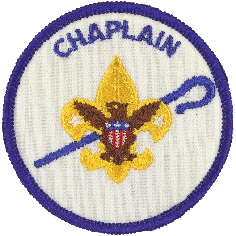 - Design: Gold Tenderfoot emblem with brown eagle, blue shepherd's crook, blue border and lettering "CHAPLAIN"