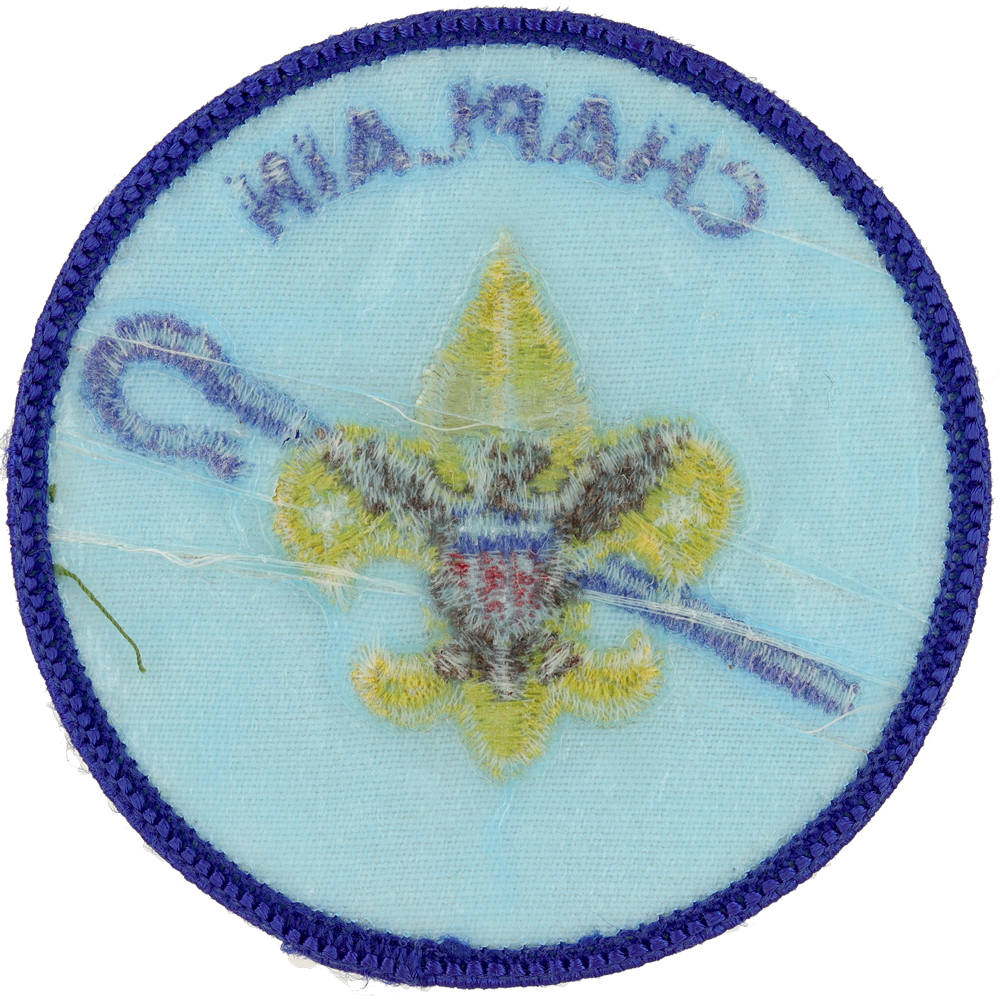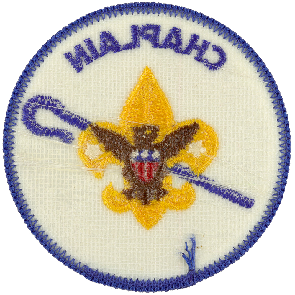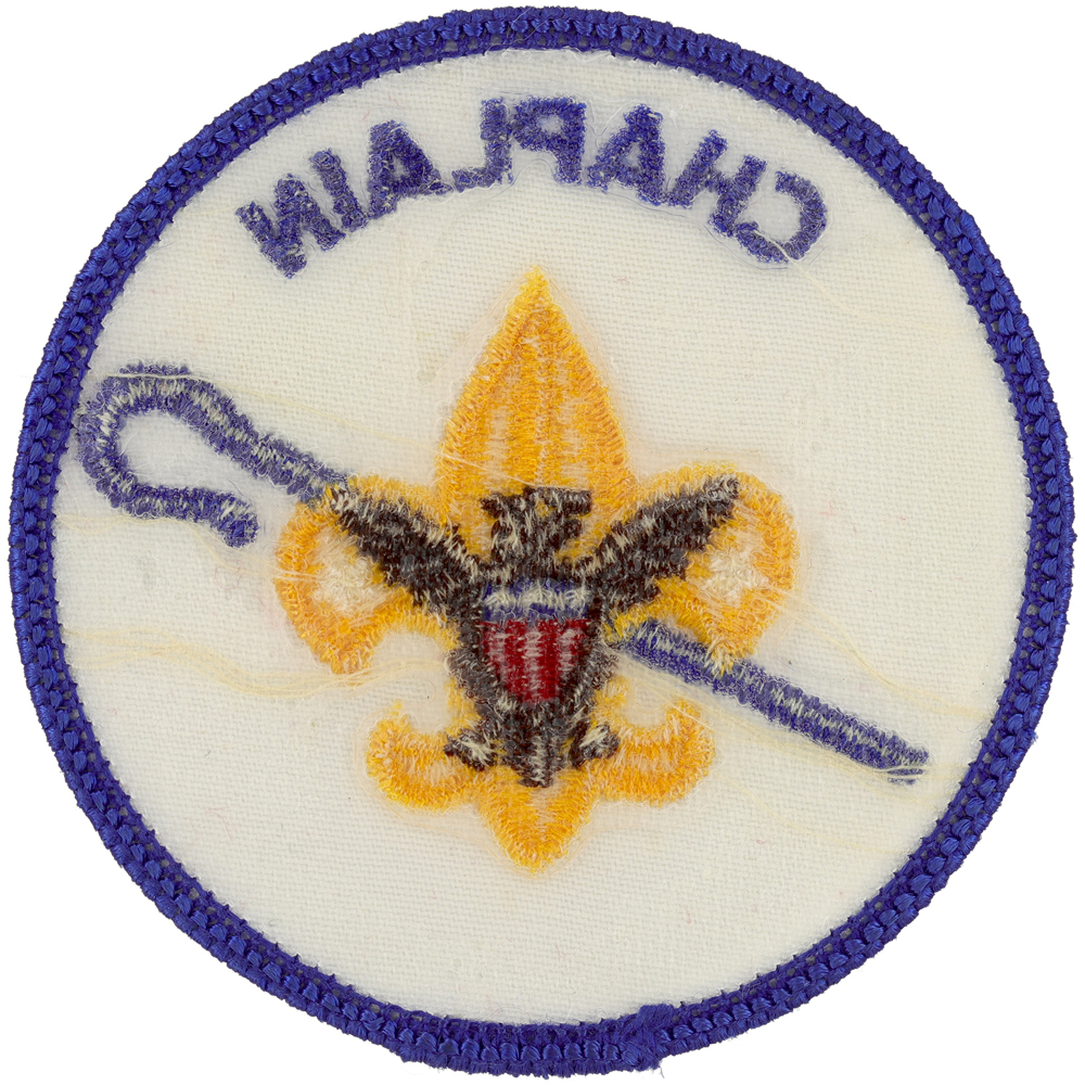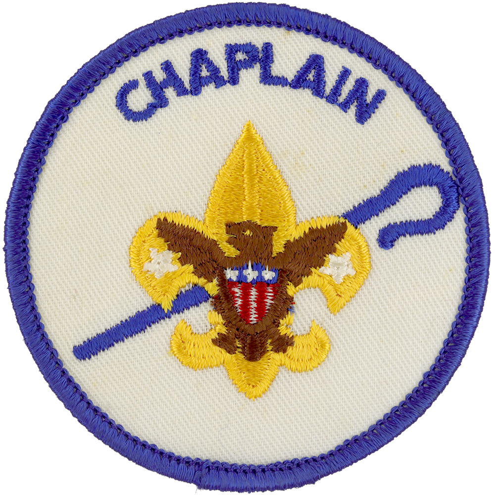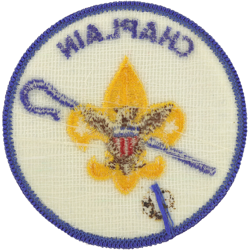 - Design: Gold Tenderfoot emblem with brown eagle, blue shepherd's crook, blue border and lettering "CHAPLAIN"