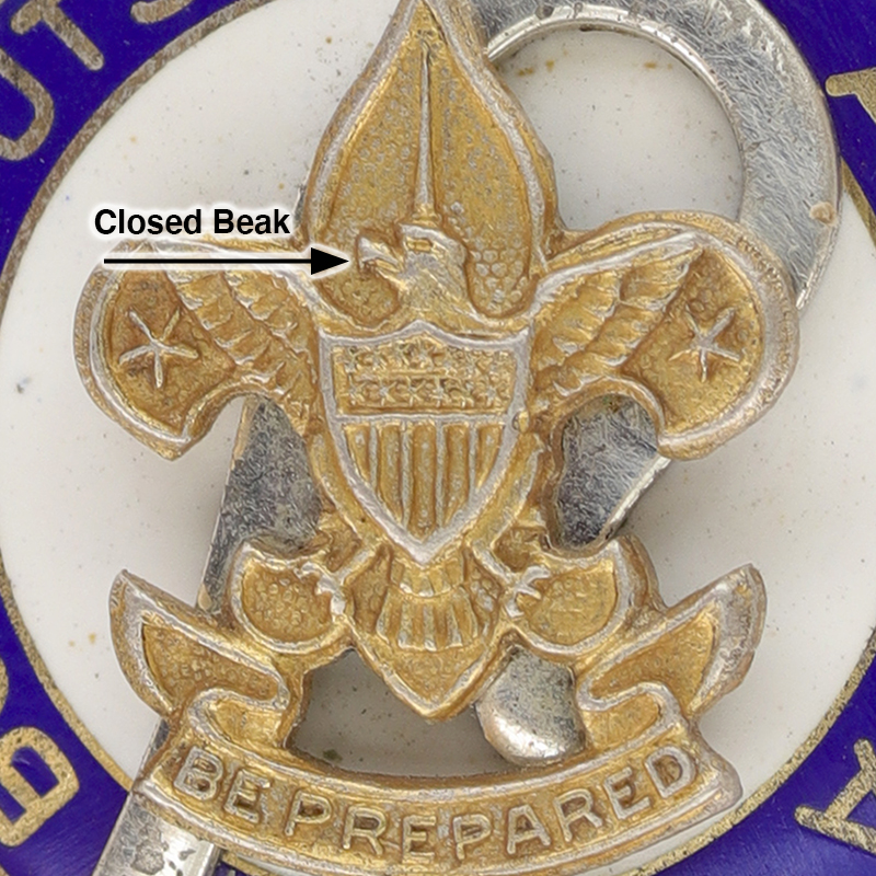 - Design: 3 dimensional tall crown gold first class, gold "BOY SCOUTS OF AMERICA", silver shepherd's crook