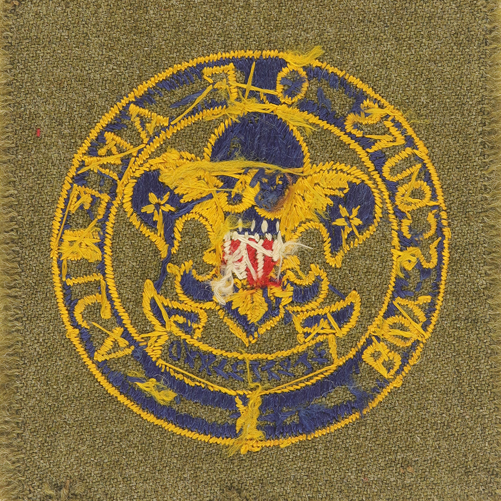 - Design: Dark blue First Class emblem with gold eagle and outline, gold border and lettering "BOY SCOUTS OF AMERICA", dark blue background behind letters