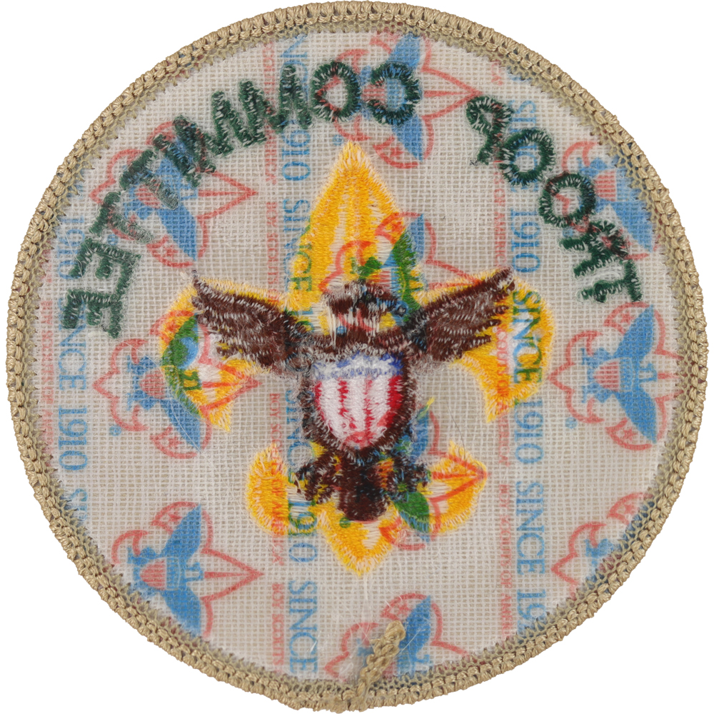- Design: Gold Tenderfoot emblem with brown eagle, tan border, green lettering "TROOP CO mmITTEE"
