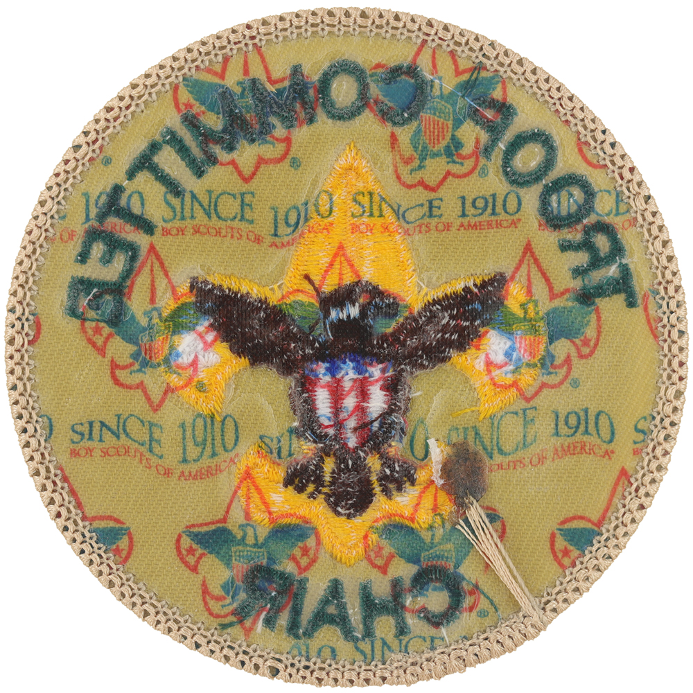 - Design: Gold Tenderfoot emblem with brown eagle, tan border, green lettering "TROOP CO mmITTEE CHAIR", eagle tail feathers rounded bottom