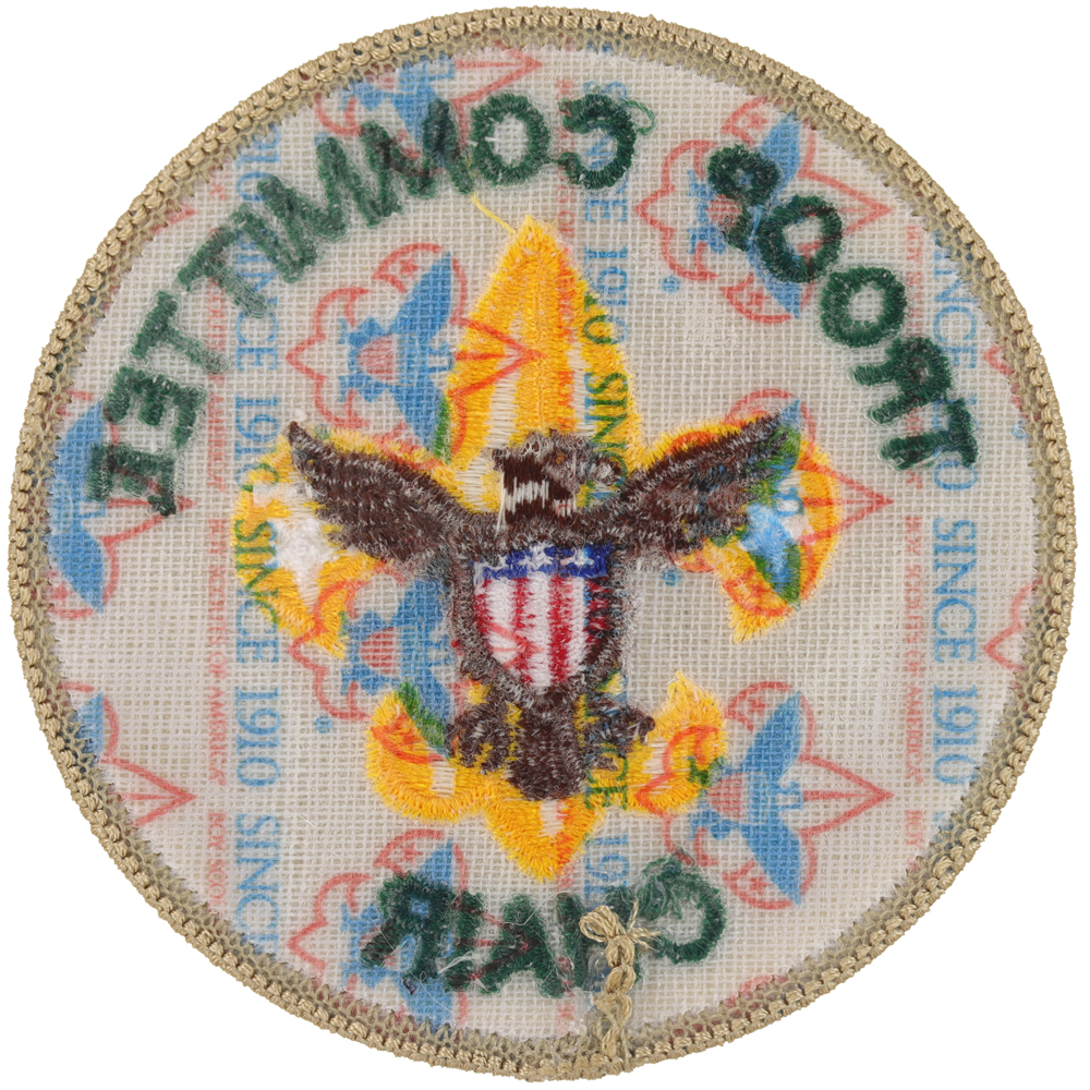 - Design: Gold Tenderfoot emblem with brown eagle, tan border, green lettering "TROOP CO mmITTEE CHAIR", eagle tail feathers flat bottom