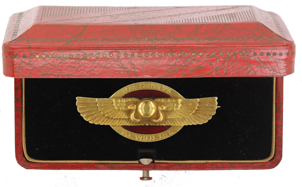 - Design: Oval with extended wings, two snakes pointing outward, raised lettering "FOR SERVICES TO WILD LIFE"