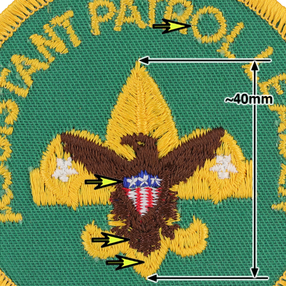 - 40mm Gold Tenderfoot with brown eagle, 3 distinct stars, 5 tail feathers same width at bottom and top, "O" in patrol is round, vertical stitching in base of FDL