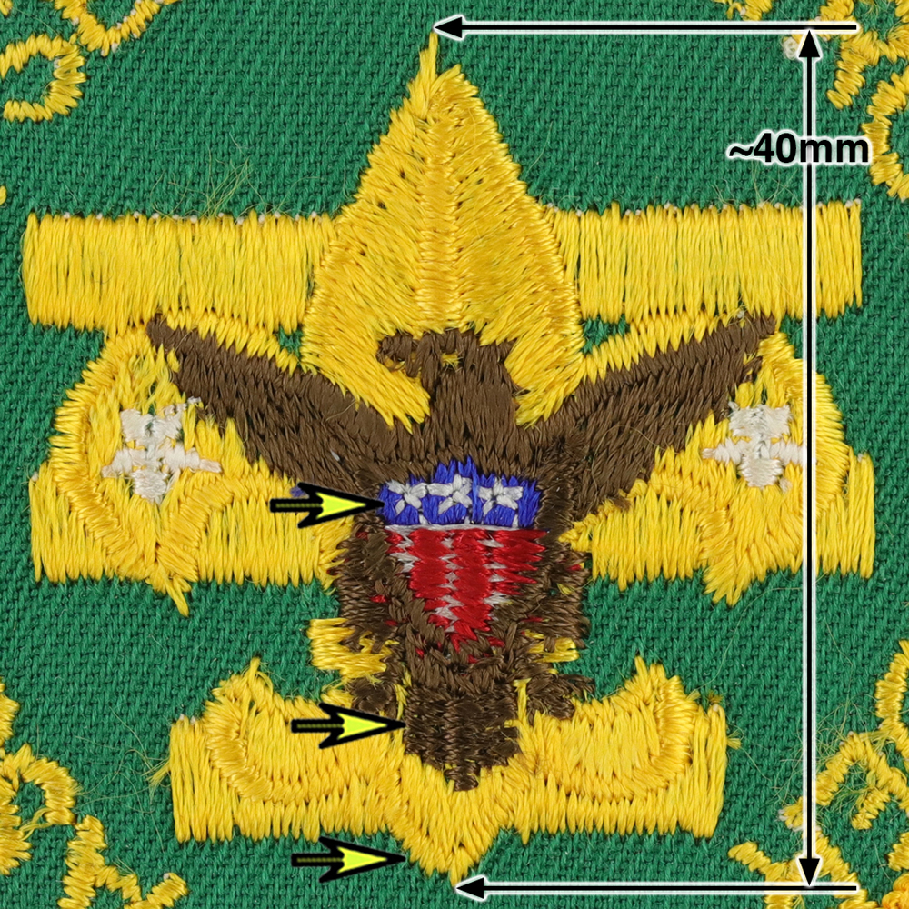 - 40mm Gold Tenderfoot with brown eagle, 3 distinct stars, 5 tail feathers slightly narrower at top than bottom, FDL extends below bottom bar, wing tops are almost straight