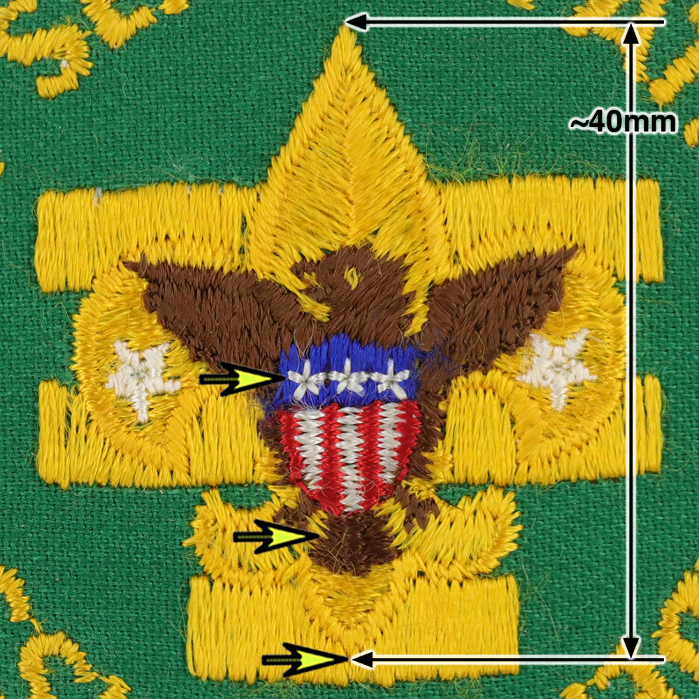 - 40mm Gold Tenderfoot with brown eagle, 3 distinct stars, 3 tail feathers narrower at top than bottom, FDL does NOT extend below bottom bar