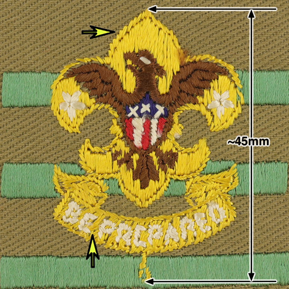 - 45mm including knot gold squatty crown 1st class with brown eagle, vertical stitch scroll, 47 x 6mm bars