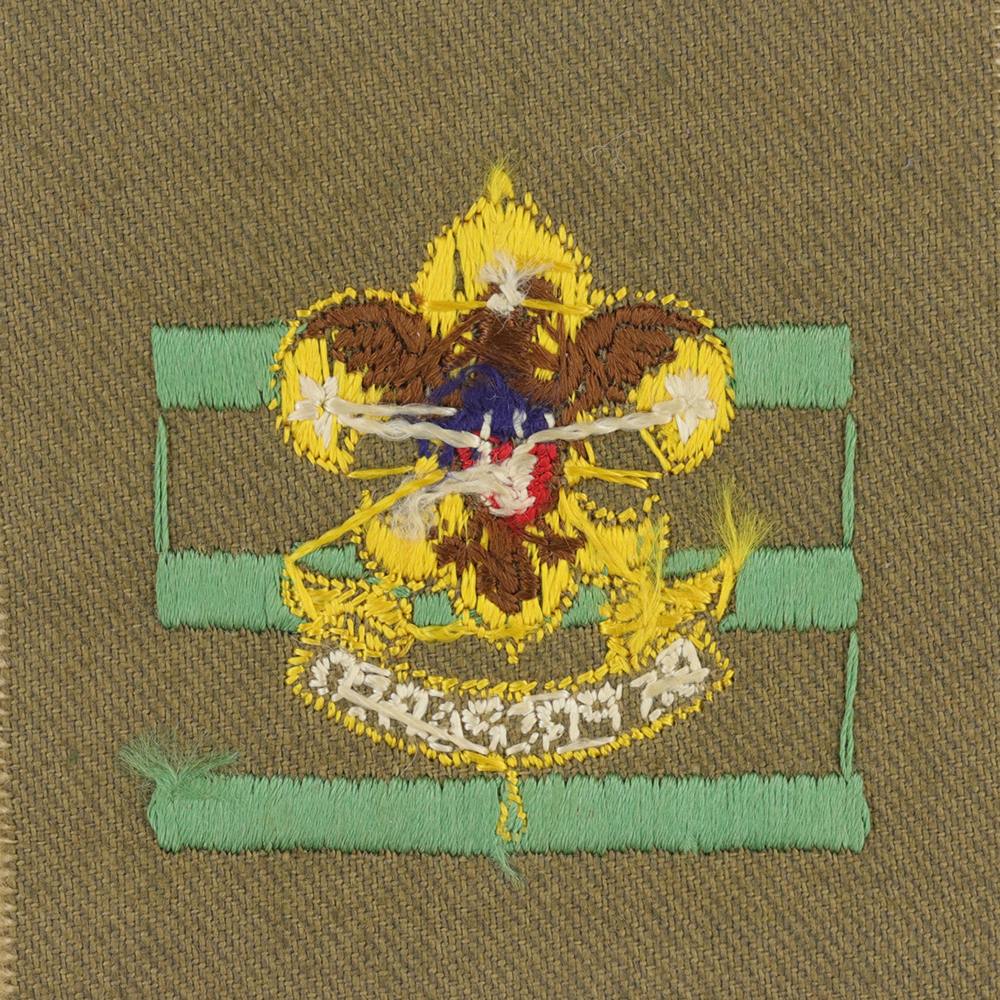 The rank also offers an outlet for the older boys energy as special instructor, or some other definite service to the troop, but not as assistant scoutmaster. A special group may be so commissioned and put in charge of first aid work, cycling, signaling, etc. In this case the Junior assistant scoutmaster does not outrank the senior patrol leader. This rank in no way modifies patrol organization, or except in the first two cases mentioned, does the Junior assistant scoutmaster outrank the senior patrol leader, or modify his duties. There is no limit to the number of Junior assistant scoutmasters a true may have; they pay the same registration fees as other Scouts, and are registered on the same blanks, with a notation indicating their rank. The warrant issued by the local Council may be any simple written or printed certificate. Blanks may be procured at a nominal cost from the National Office. The insignia of this rank is three fold bars on the sleeve, below the first class badge, and the metal hat badge is a gold first-class pen superimposed on three full bars of green.