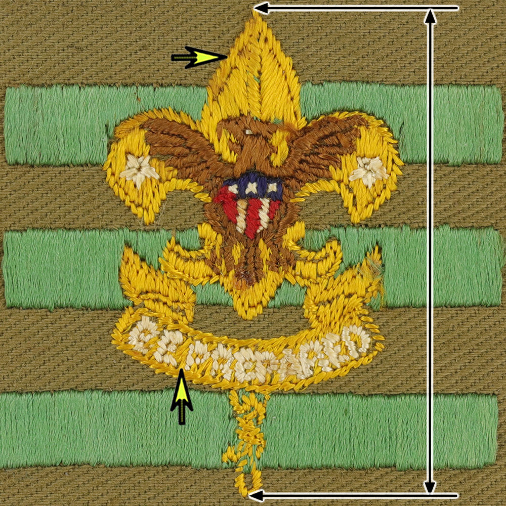 - 48mm including knot gold tall crown 1st class with brown eagle, vertical stitch scroll, 49 x 8mm bars