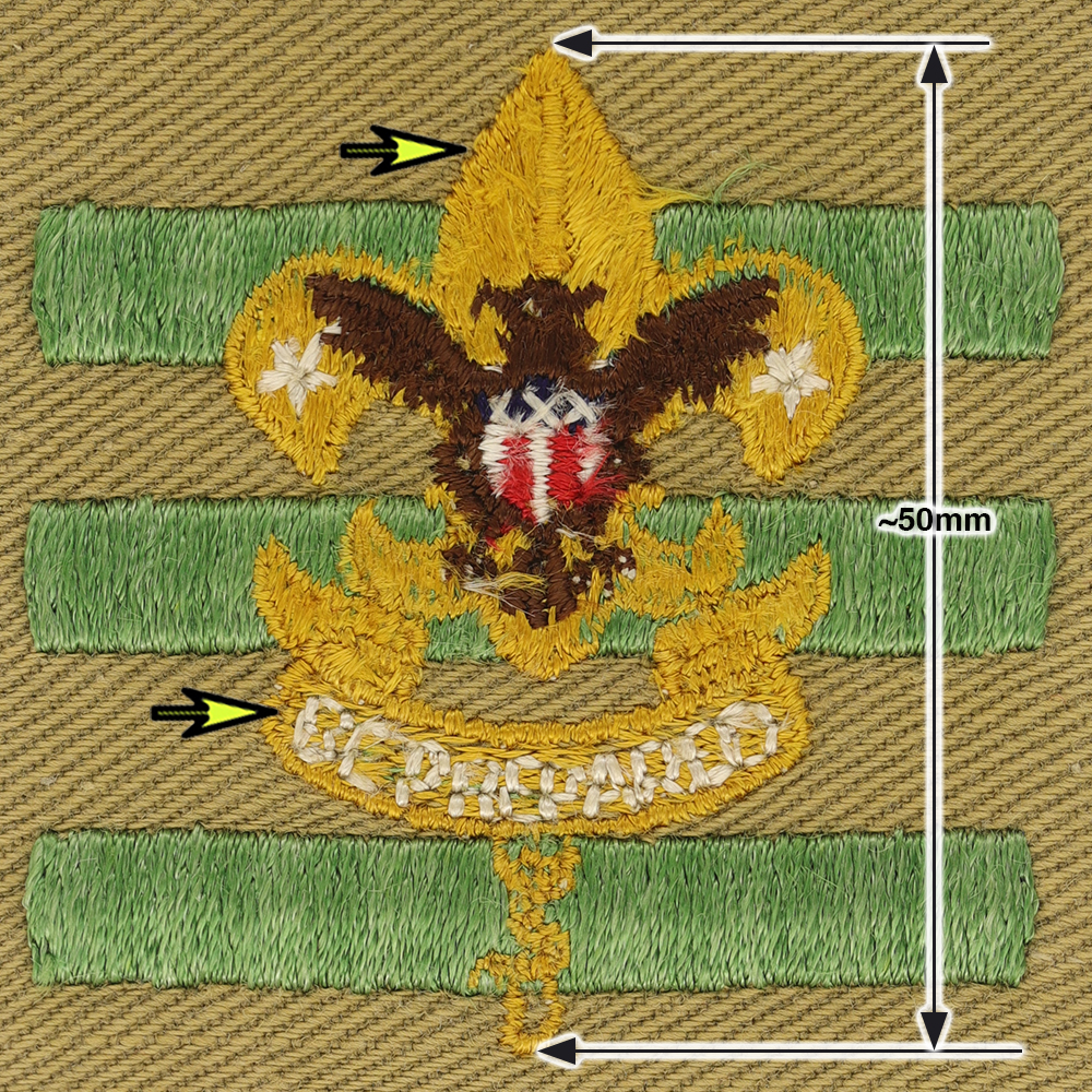 - 49mm including knot gold tall crown 1st class with brown eagle, horizontal stitched smile, 7mm bars