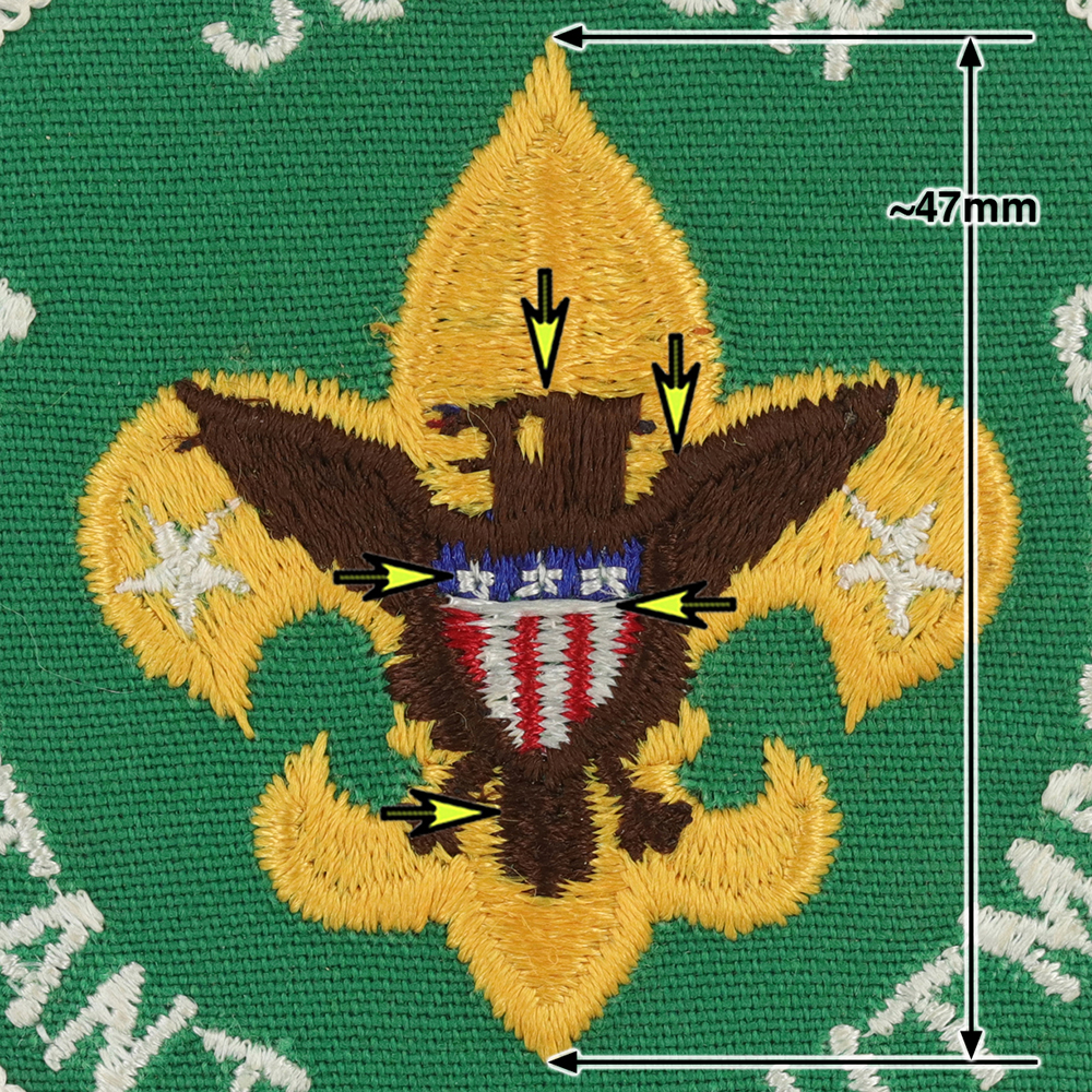 - 47mm Gold Tenderfoot with brown eagle, 3 straight narrow tail feathers, flat top eagle head, gentle curves on wing tops, , white stitch separates the blue and red in shield, thin legs