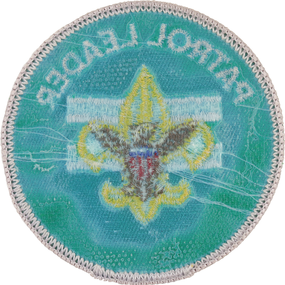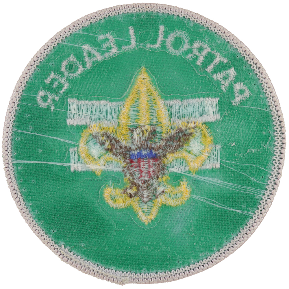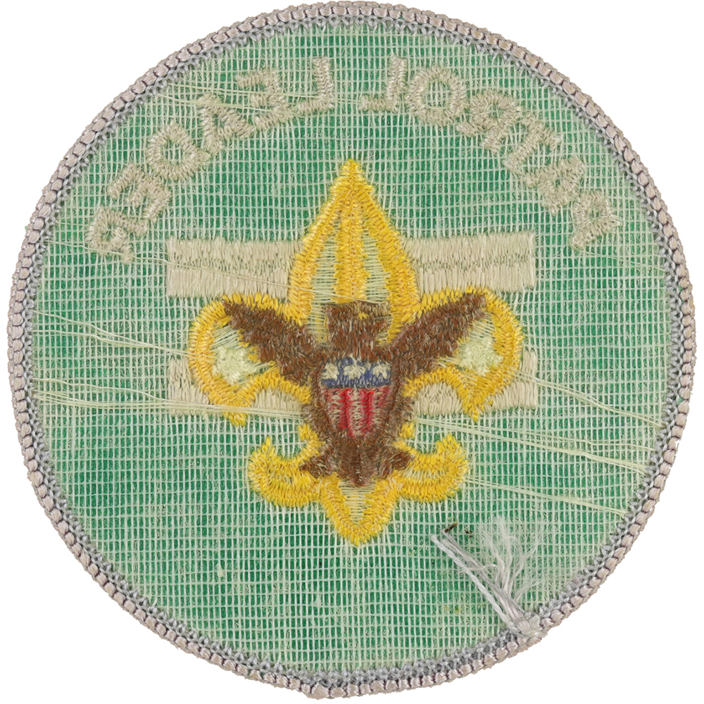 - Left twill, 42mm Gold Tenderfoot with brown eagle, 3 indistinct stars, 3 tail feathers narrower at bottom than top, horizontal stitching in base of FDL