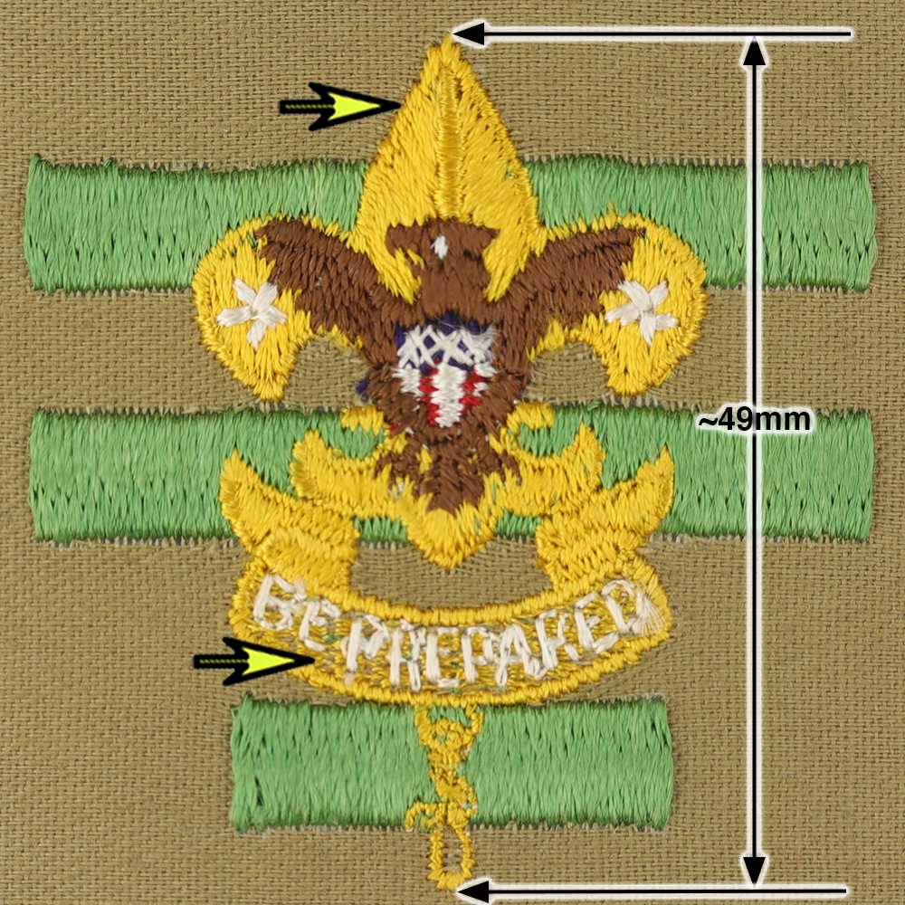 - 49mm including knot, gold tall crown 1st class with brown eagle, horizontal stitched smile, 7mm bar width