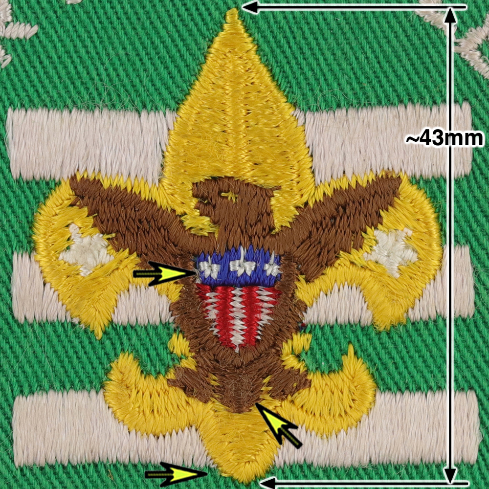 - Left twill, 43mm Gold Tenderfoot with brown eagle, 3 indistinct stars, 3 tail feathers narrower at bottom than top, FDL extends below bottom bar