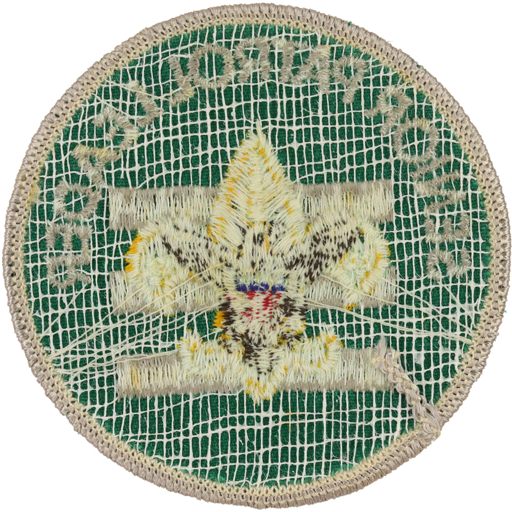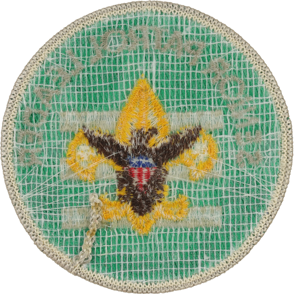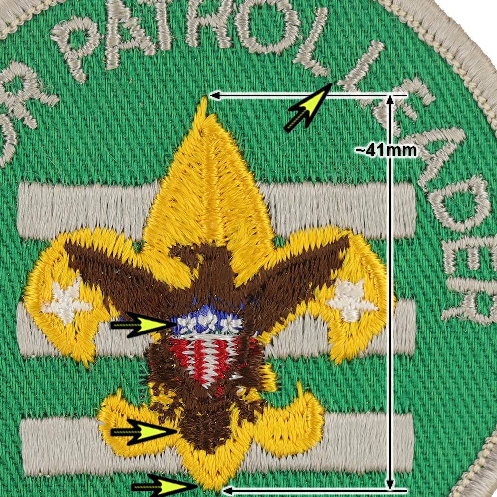 - Twill left, 41mm Gold Tenderfoot with brown eagle, 3 distinct stars, 5 tail feathers slightly narrower at top than bottom, FDL extends below bottom bar, "L" in patrol and "L" in leader close together