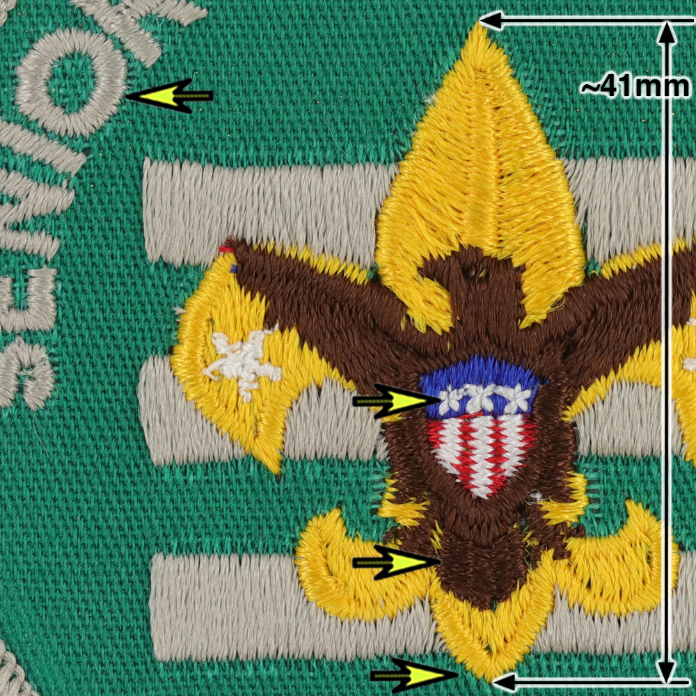 - Fine left twill, 41mm Gold Tenderfoot with brown eagle, 3 distinct stars, 5 tail feathers slightly narrower at top than bottom, FDL extends below bottom bar, "O" of SENIOR is elliptical horizontally