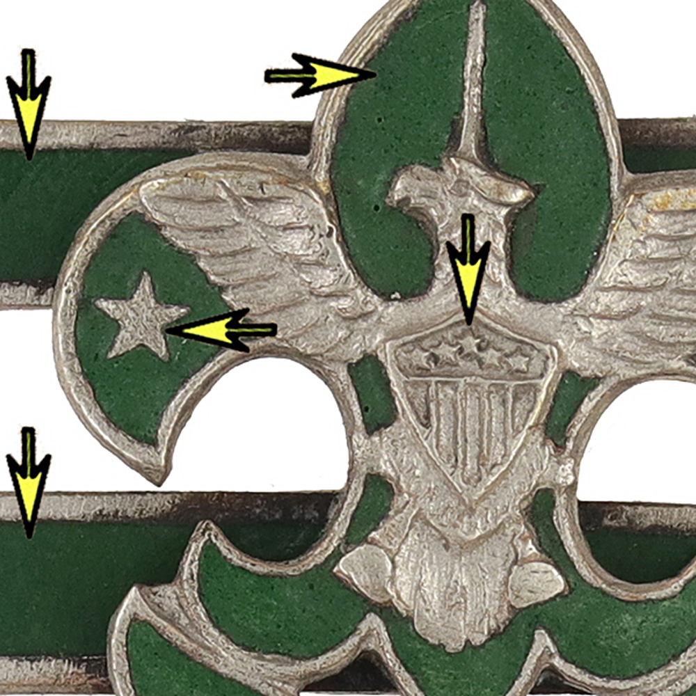 - Dark green enamel in squatty crown, five stars arched in the shield, upright large truth & knowledge stars