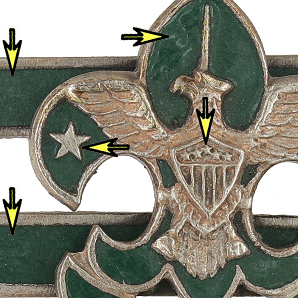 - Dark green enamel in squatty crown, five stars arched in the shield, upright large truth & knowledge stars