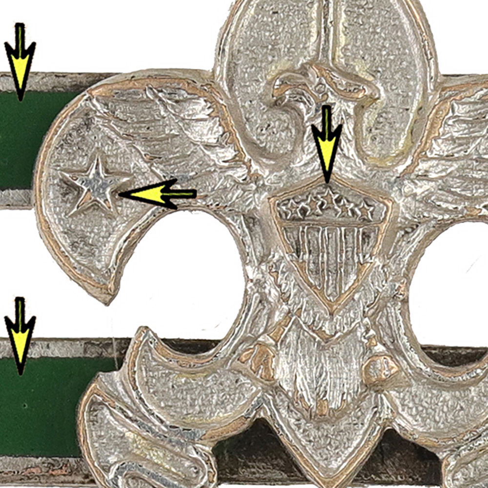 - Five stars arched in the shield, upright medium truth & knowledge stars, dark green enamel bars