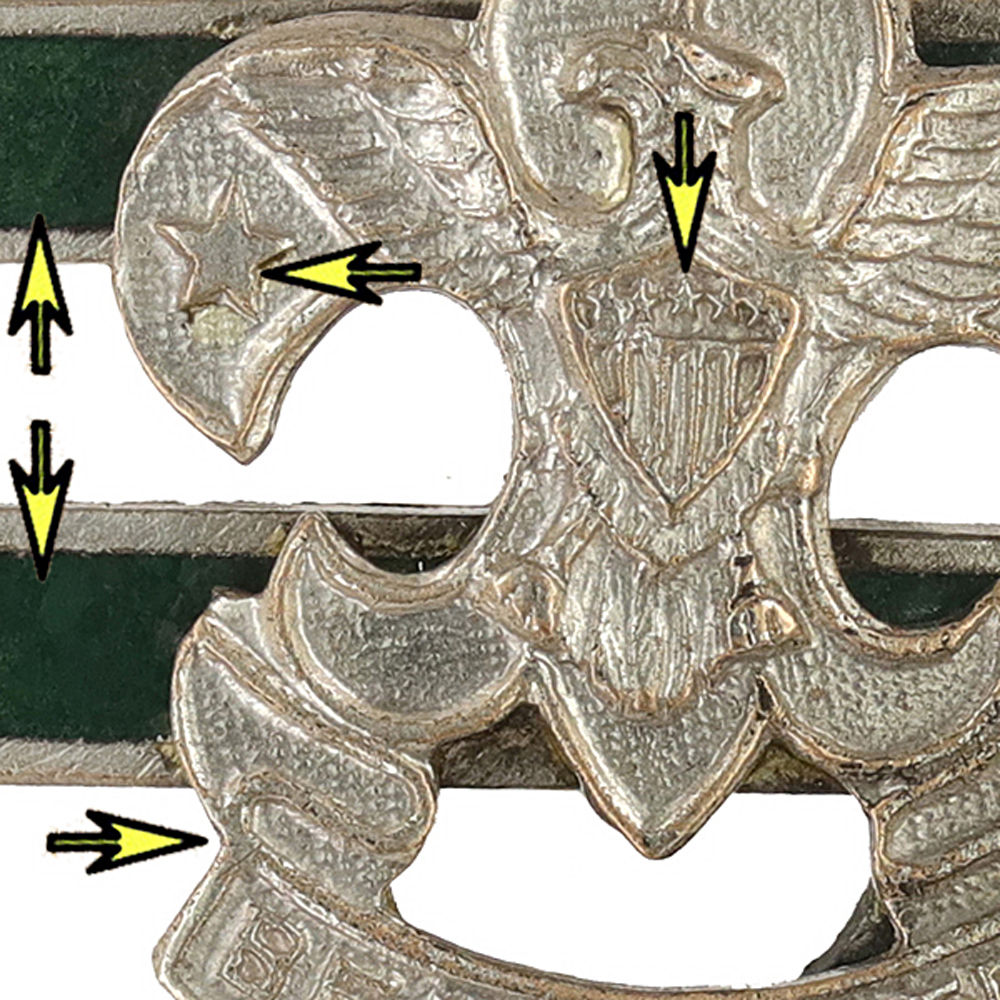 - Emblem: Five stars in a row in the shield, squatty silver crown, upright large truth & knowledge stars, top ribbon loop meets at scroll top on left