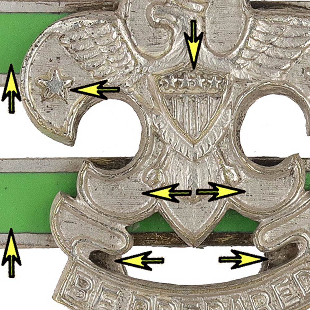 - Four stars in shield evenly spaced, space between left shield star and shield edge, flat medium truth & knowledge stars, fine background lines, cutout scroll, light green enamel in bars