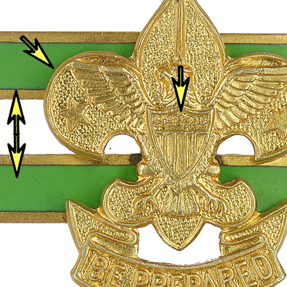 - Wide shoulders, larger stars on an angle beneath the wings, seven stars in shield, light green enamel in bars