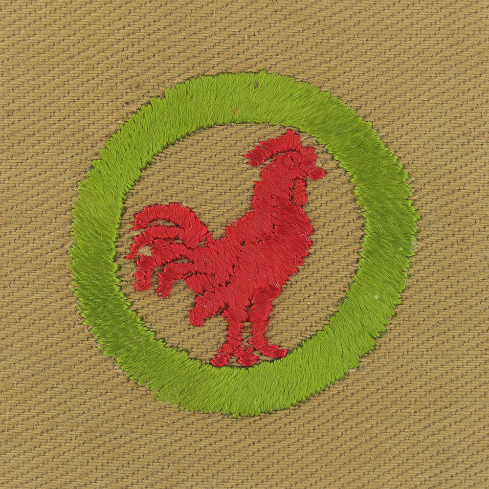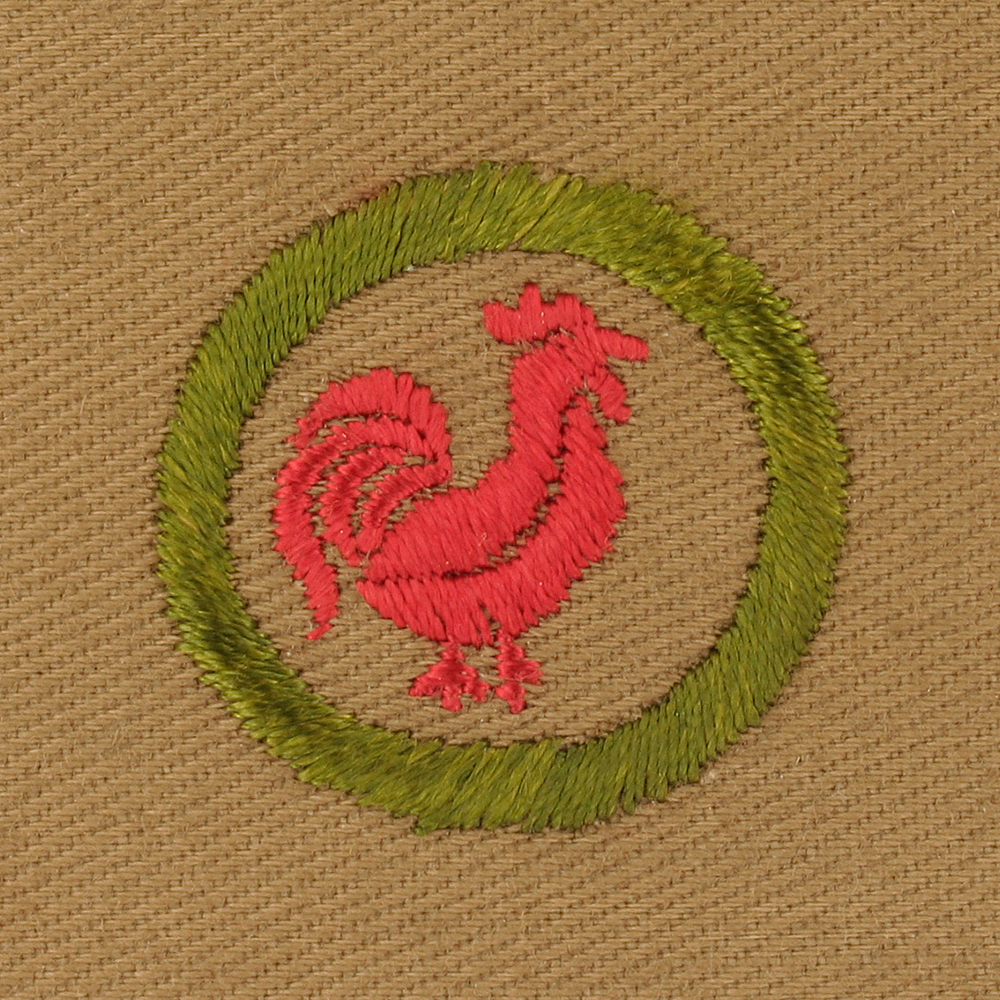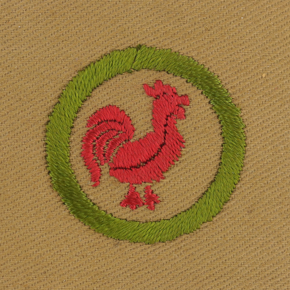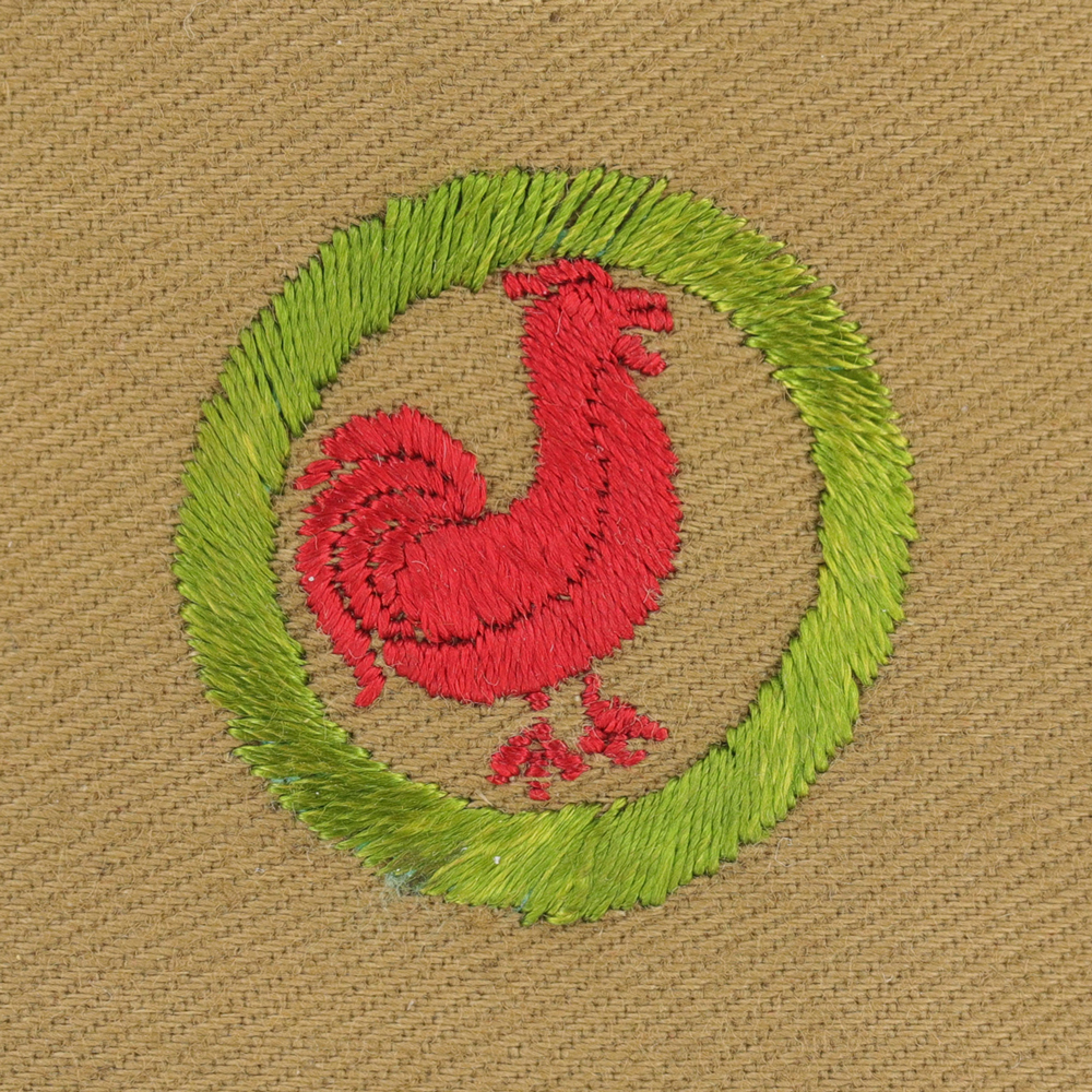 - Design: Eye, comb has two points, top and bottom beak, 1st tail feather ends inside body, 3rd tail extends below body, short legs