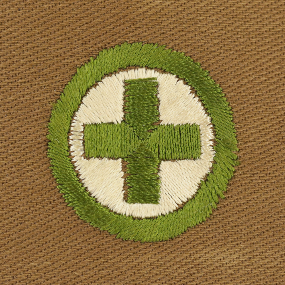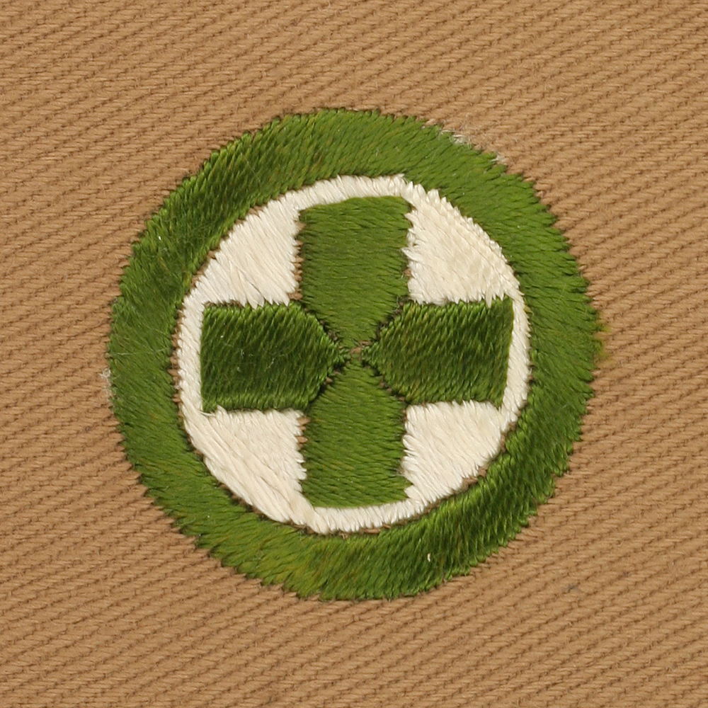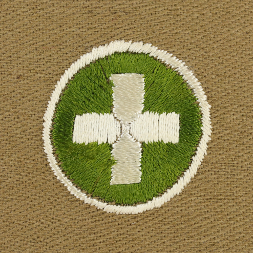 - Design: Green cross with single diagonal stitch in middle of cross, many visible embroidery joints in white background, white is horizontal embroidery