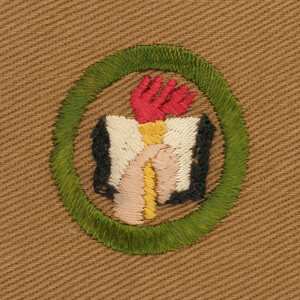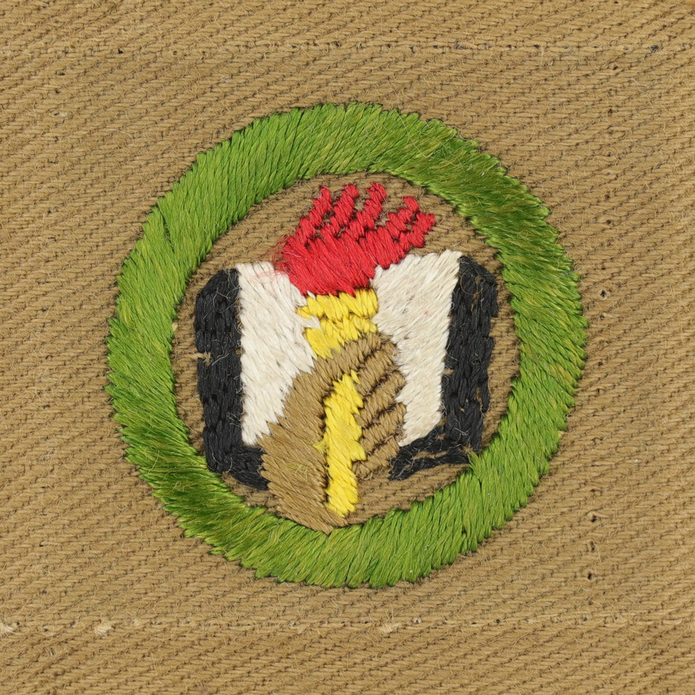 - Design: Five thin fingers of flame with space between flames, tan hand embroidered downward left to right, wide wrist, open hand, fingers easily distinguished, torch handle wide taper at bottom, black is stitched upward left to right on left opposite on right