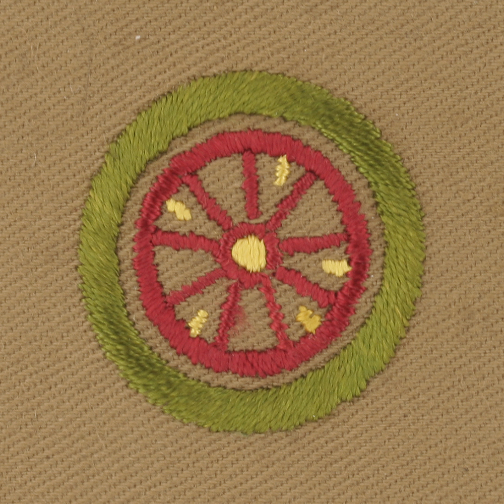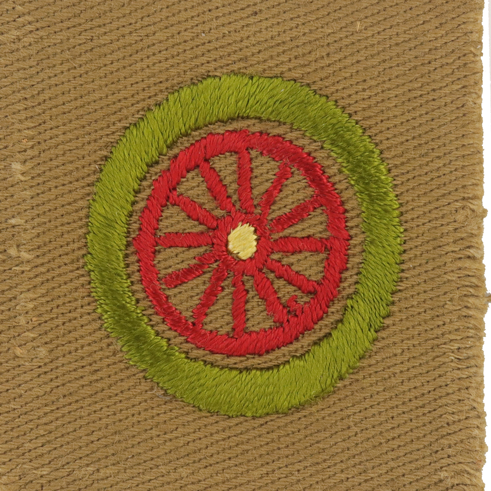 - Design: Red wheel touches green border, nine spokes, four valves, three spokes between valves upper right, center yellow embroidery parallel to spoke with NO valve on either side