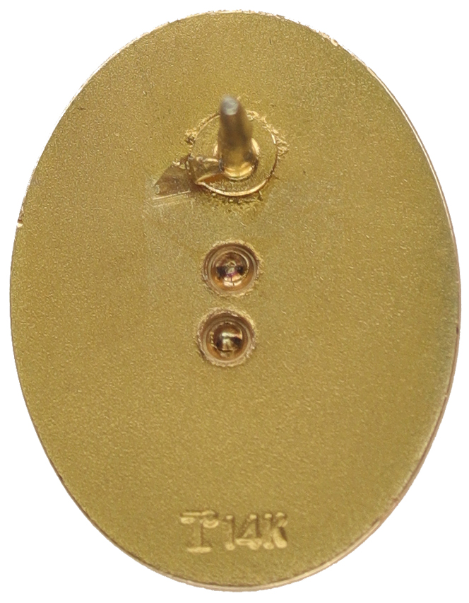 - Design: Pebbled outer border between the outer and inner ovals surrounding the Blue-White-Red enamel