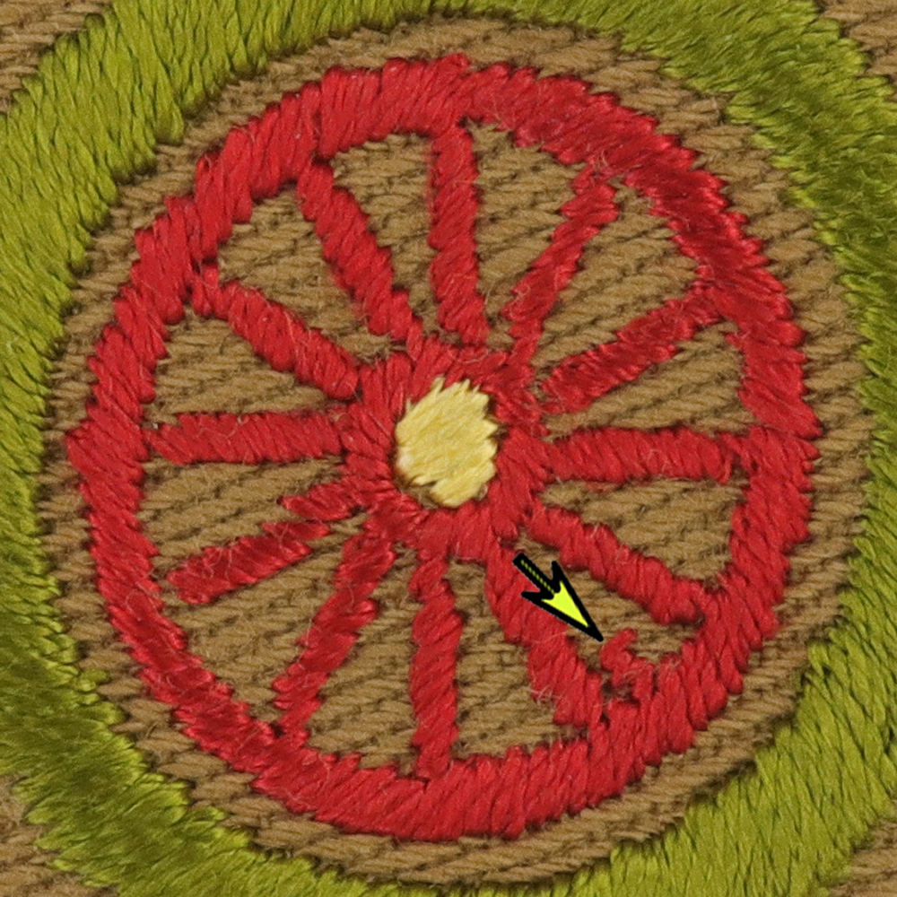 - Design: 12 spokes, one red valve, yellow 45 degree stitched center