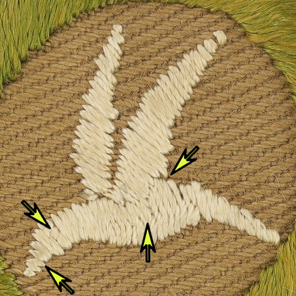 - Design: Eye, short beak, bird body has 2 rows of embroidery which leaves center line, left and right wings do not overlap, left bird wing dips into bird body and connects fully to body