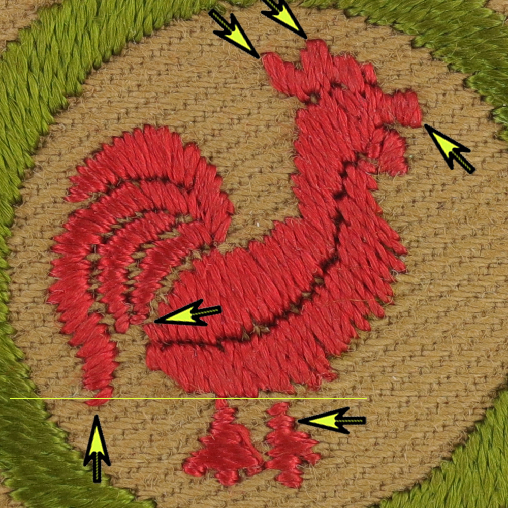 - Design: NO eye, comb has two large and two small points, solid straight beak, short wattle, 1st tail feather ends at back of body, 3rd tail feather extends below body, short legs