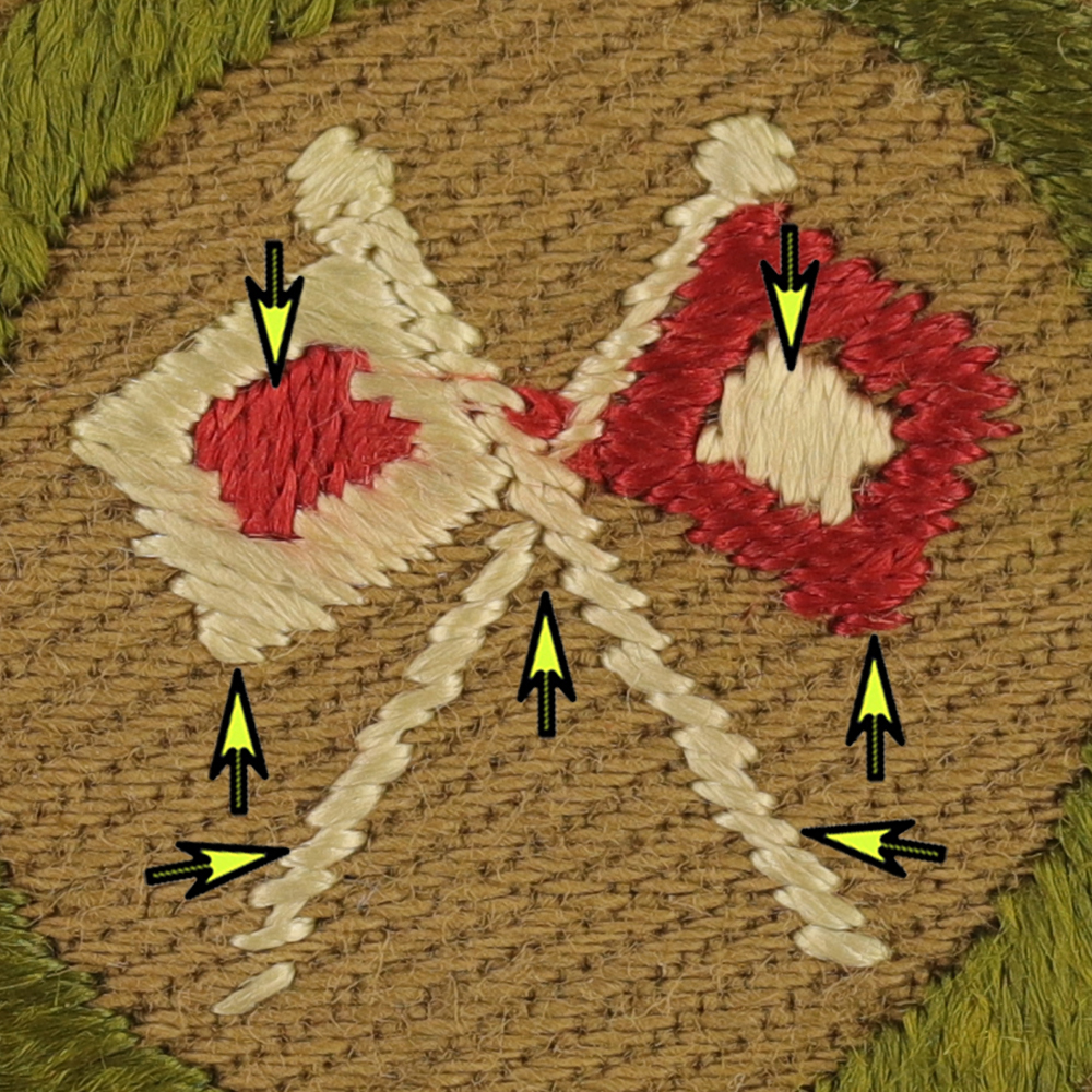 - Design: White flag on left, flags horizontally stitched outer, flags vertically stitched centers, white flag pole crosses over red, flag poles have almost horizontal stitches