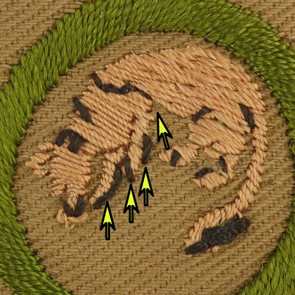 - Design: Copper almost horizontally embroidered cougar, stomach is indented, 2 short and 1 long black highlight in front legs