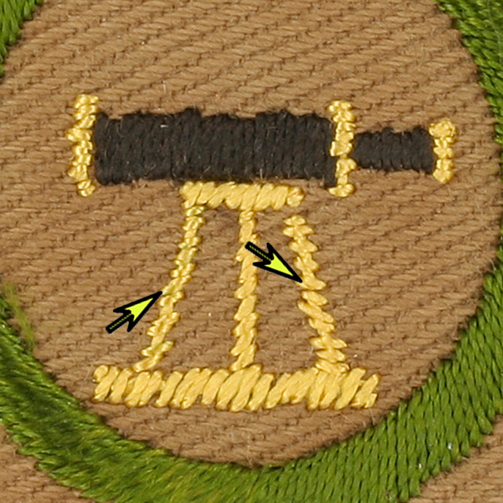 - Design: Three legs, left leg stitching angles upward left to right, right leg stitching angles downward left to right, black telescope embroidery vertical